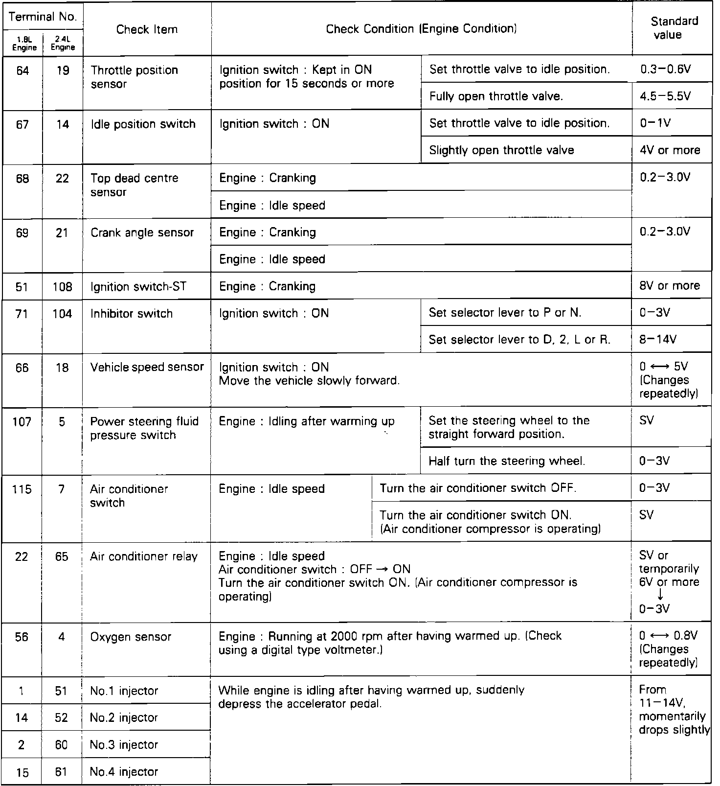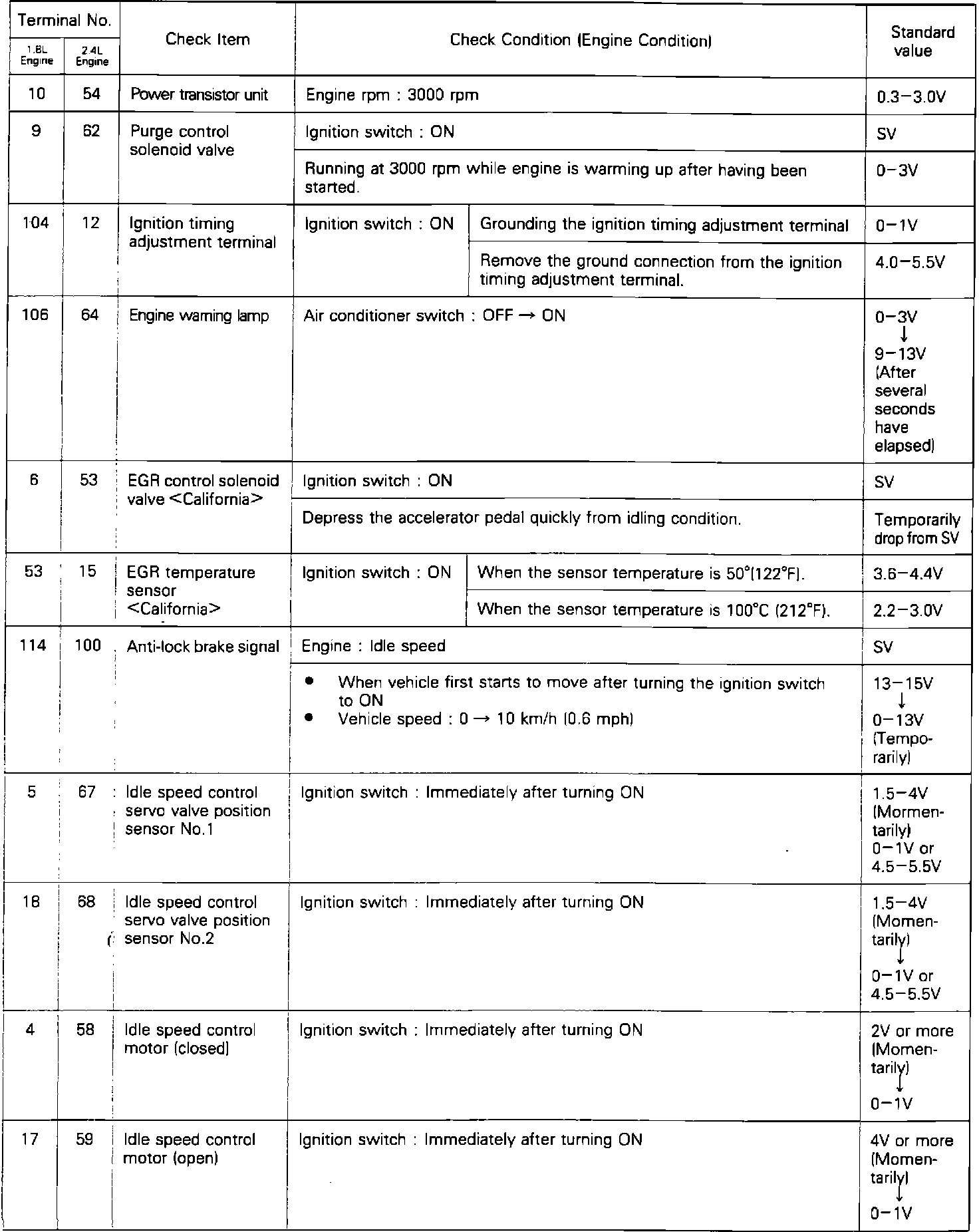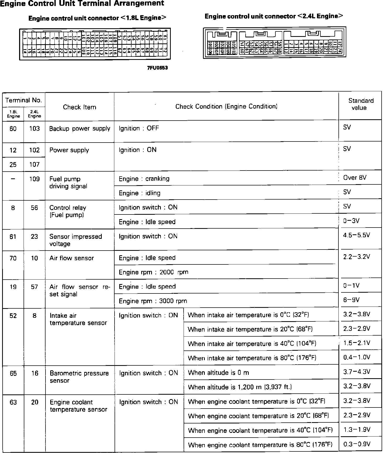 ^ Use the ground pin (terminal # 26 on 1.8L, terminal # 106 on 2.4L) as the ground for the voltmeter.