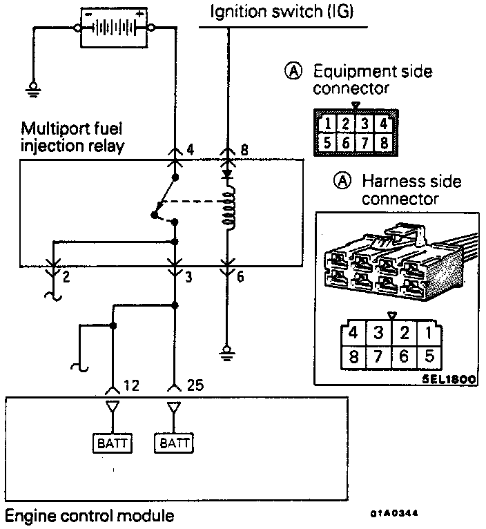When the ignition switch is turned ON current flows from the ignition switch through the multiport fuel injection relay coil to ground. This turns "ON" the multiport fuel injection relay switch and power is supplied from the battery through the multiport fuel injection relay switch to the engine control module.