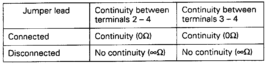6. Check the continuity between multiport fuel injection relay terminals 2 - 4 and terminals 3 - 4 while connecting and disconnecting the jumper lead at the battery (-) terminal.