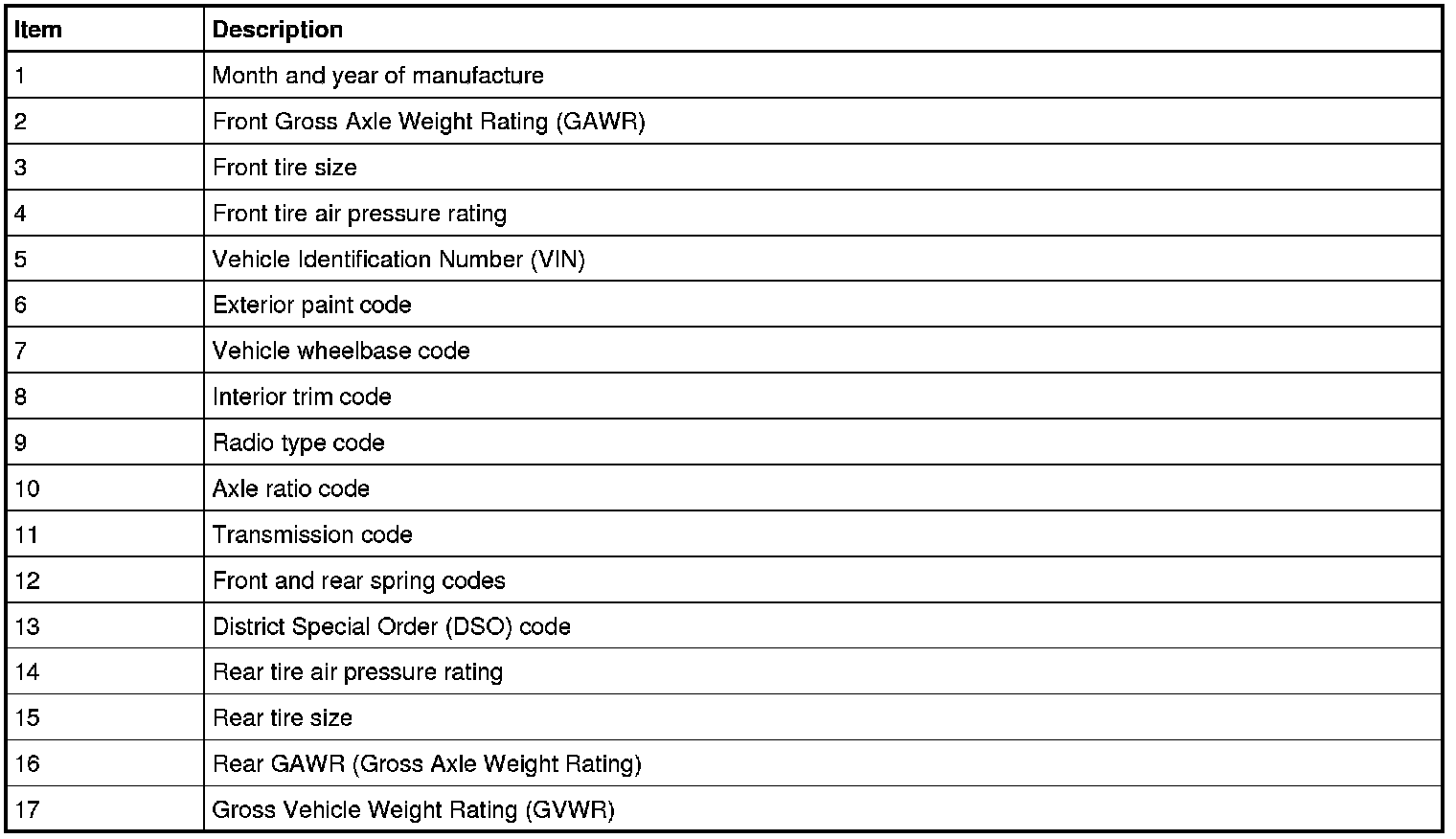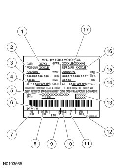 The Vehicle Identification Label (VIL) contains the manufacturer name, the month and year of manufacture and the Vehicle Identification Number (VIN). It also includes Gross Vehicle Weight Rating (GVWR) and tire information.