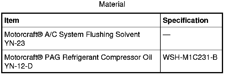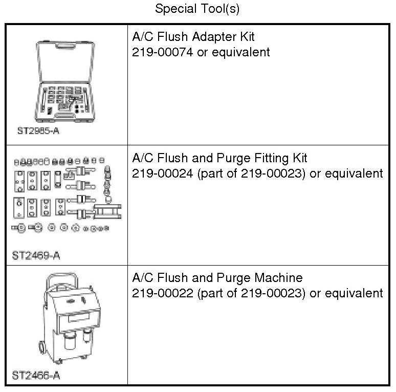 NOTICE: Only the listed A/C Flush and Purge Machine, A/C Flush and Purge Fitting Kit, A/C Flush Adapter Kit and A/C System Flushing Solvent are approved for use on Ford vehicles. No other flushing device or solvent is approved for flushing heat exchangers (Air Conditioning [A/C] condenser, A/C evaporator). Use of any other flusher or solvent may cause damage to the A/C system and the flushing unit.