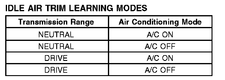 Idle air trim is designed to adjust the idle air control calibration to correct for wear and aging of components. When the engine conditions meet the learning requirement, the strategy monitors the engine and determines the values required for ideal idle calibration. The idle air trim values are stored in a table for reference. This table is used by the PCM as a correction factor when controlling the idle speed. The table is stored in the KAM and retains the learned values even after the engine is shut OFF. A DTC is set if the idle air trim has reached its learning limits.