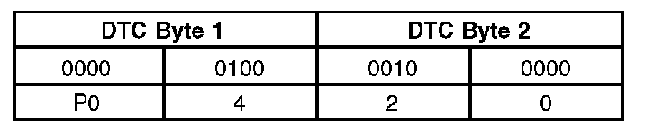 Like all digital signals, DTCs are sent to the scan tool as a series of 1s and 0s. Each DTC is made up of 2 data bytes, each consisting of 8 bits that can be set to 1 or 0. In order to display the DTCs in the conventional format, the data is decoded by the scan tool to display each set of 4 bits as a hexadecimal number (0 to F). For example, P0420 Catalyst System Efficiency Below Threshold (Bank 1).