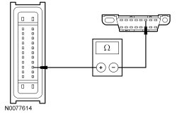 - Measure the resistance between the ABS module C135-21, circuit 5-EC7 (BU/RD), harness side and the DLC (Data Link Connector) C251-14, circuit 5-EC7 (BU/RD)/5-EC8 (BU/WH), harness side.