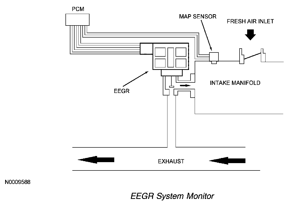 The EEGR system monitor is an on board strategy designed to test the integrity and flow characteristics of the EGR system. The EEGR system monitor consists of an electrical and functional test that checks the stepper motor and the EEGR system for correct flow. The powertrain control module (PCM) controls the EEGR valve by commanding from 0 to 52 discrete increments or steps to get the valve from the fully closed position to the fully open position. The stepper motor electrical test is a continuous check of the 4 electric stepper motor coils and circuits to the PCM. A concern is indicated if an open circuit, short to voltage, or short to ground has occurred in one or more of the stepper motor coils or circuits for a calibrated period of time. If a concern has been detected, the EEGR system is disabled, setting a diagnostic trouble code (DTC). Additional monitoring is suspended for the remainder of the drive cycle, or until the next engine start.