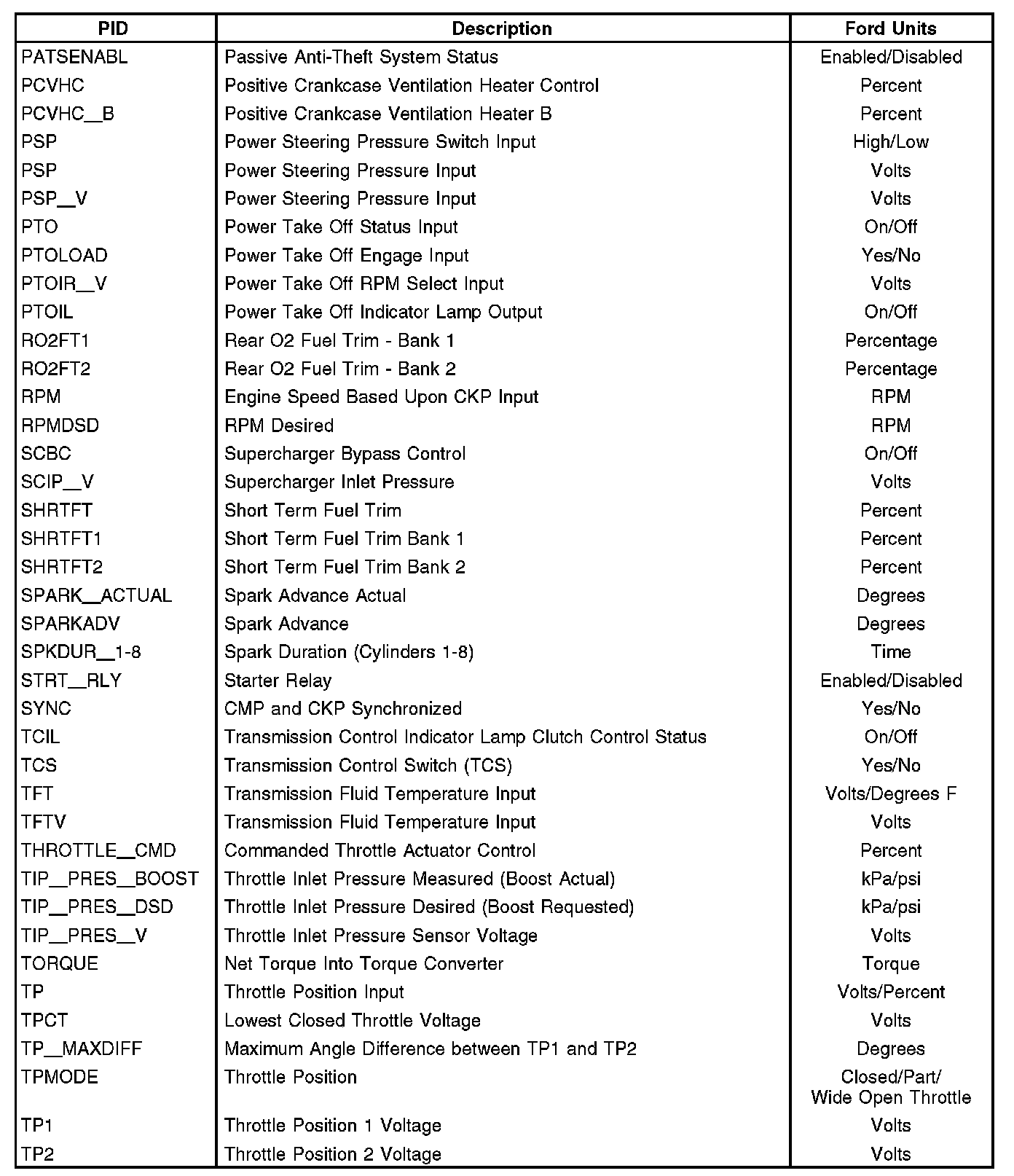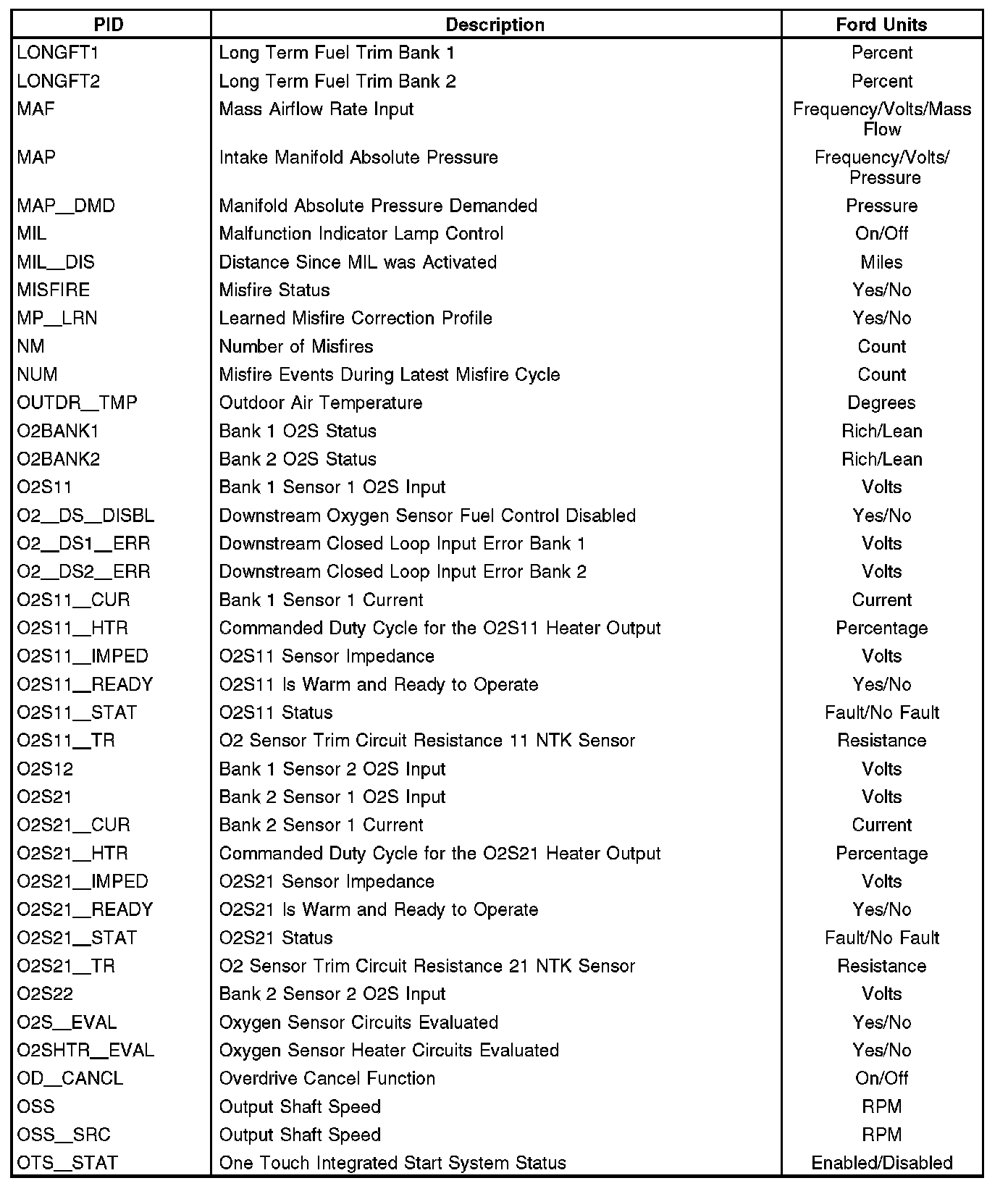 The PID mode allows access to powertrain control module (PCM) information. This includes analog and digital signal inputs and outputs along with calculated values and the system status. There are two types of PID lists available and both are used throughout. The first is the generic (J1979) OBD PID list. This is a standard set of PIDs that all scan tools must be able to access. The second is a Ford specific (J2190) list which can be accessed by an appropriate scan tool. When accessing any of these PIDs, the values are continuously updated. The generic or Ford PID list provides definitions and values in appropriate units.