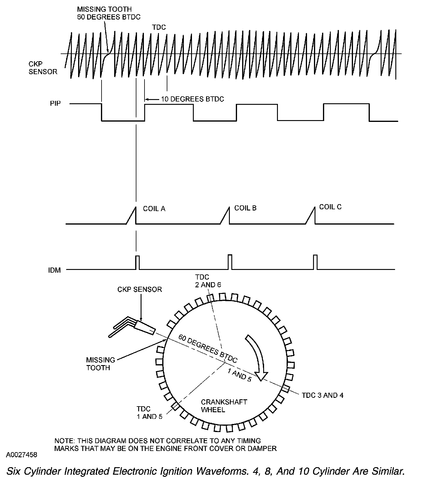 1. The CKP sensor indicates the crankshaft position and speed by sensing a missing tooth on a pulse wheel mounted to the crankshaft. The CMP sensor is used by the COP integrated electronic ignition system to identify the compression stroke of cylinder 1 and to synchronize the firing of the individual coils.