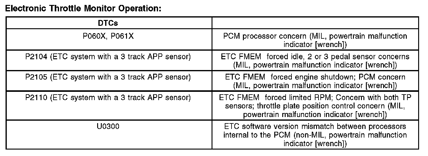 The ETC system illuminates a powertrain malfunction indicator (wrench) on the instrument cluster (IC) or instrument panel cluster (IPC) when a concern is present. Concerns are accompanied by diagnostic trouble codes (DTCs) and may also illuminate the malfunction indicator lamp (MIL).