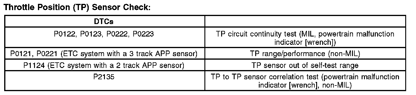 - There is one reference voltage and one signal return circuit between the PCM and the ETB. The reference voltage and the signal return circuits are shared with the reference voltage and signal return circuits used by the accelerator pedal position (APP) sensor. There are also 2 throttle position (TP) signal circuits for redundancy. The redundant TP signals are required for increased monitoring reasons. The first TP signal (TP1) has a negative slope (increasing angle, decreasing voltage) and the second TP signal (TP2) has a positive slope (increasing angle, increasing voltage). The TP2 signal reaches a limit of approximately 4.5 volts at approximately 45 degrees of throttle angle.