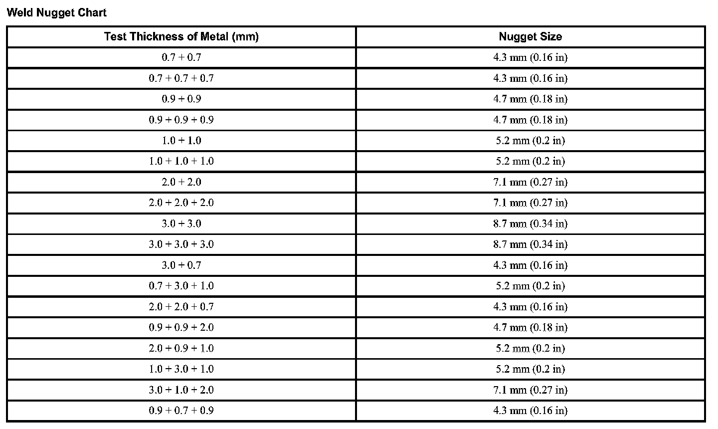 Weld Nugget Chart