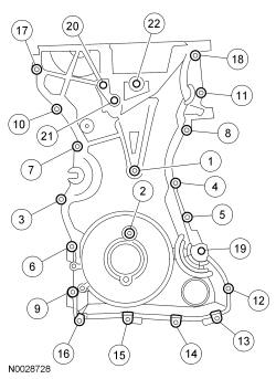 Install the engine front cover. Tighten the bolts in the sequence shown, to the following specifications: