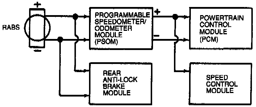 The Programmable Speedometer/Odometer Module (PSOM) receives input from the Rear Anti-Lock Brake Sensor (RABS) mounted on the rear axle differential. The PSOM sends this input signal information to the Speed Control module and the Powertrain Control Module (PCM).