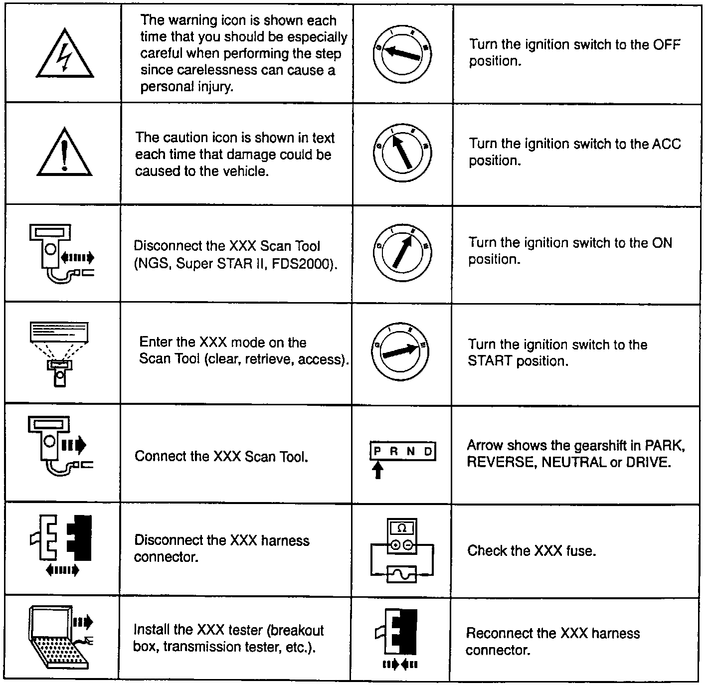 In diagnosis and testing, you will see that a number of icons are used in the pinpoint test steps. The icons will assist in diagnosing the vehicle concern in a timely manner. The icons that are used are shown in the Pinpoint Test Step Icons chart.