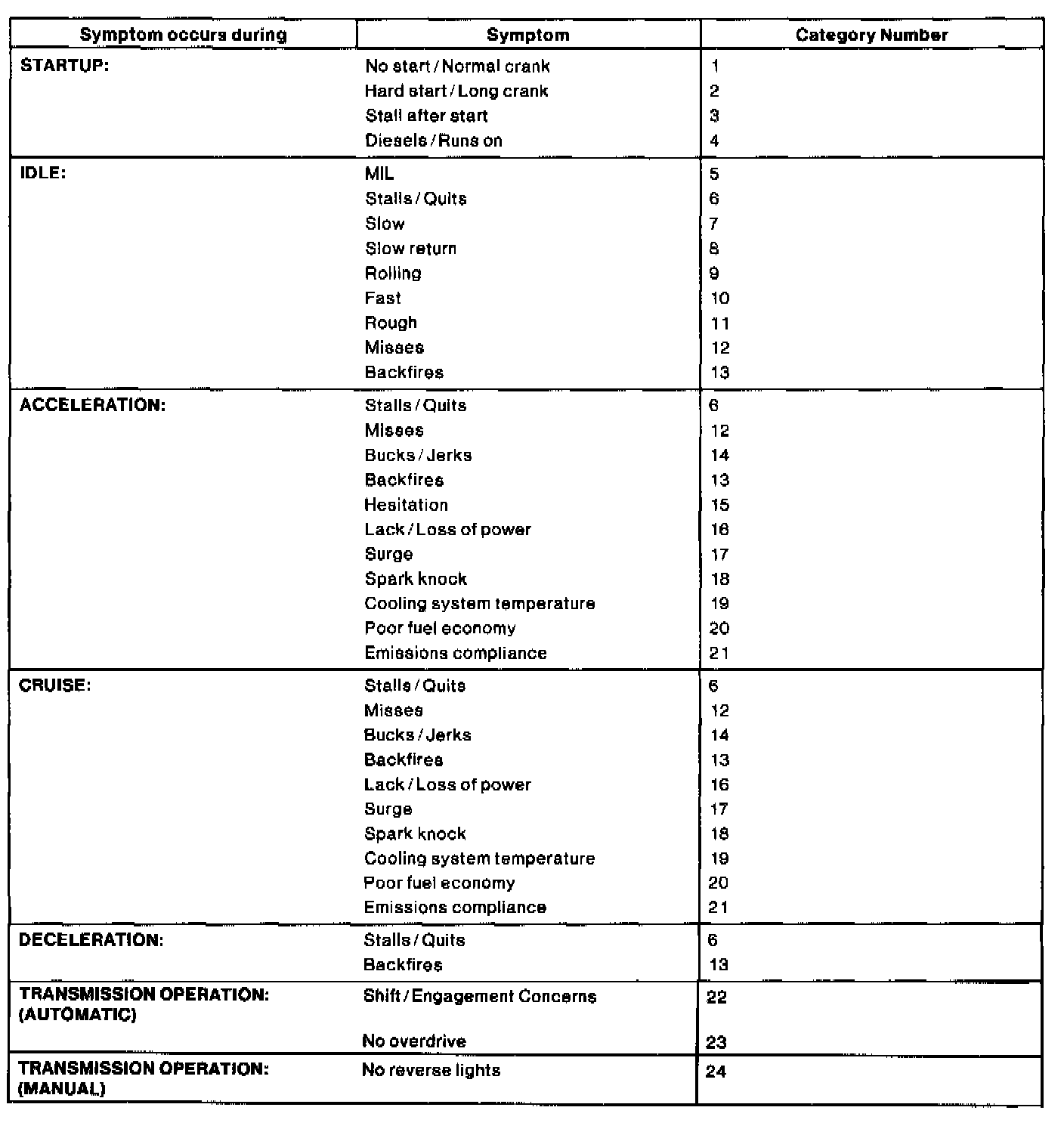 The Reference Value Symptom Chart is used to provide guidance in selecting the appropriate PID or measured signal related to the fault area. Select a symptom from the symptom chart along with the category number and proceed to the PID/Measured Signal Chart. For multiple symptoms, select the most evident.