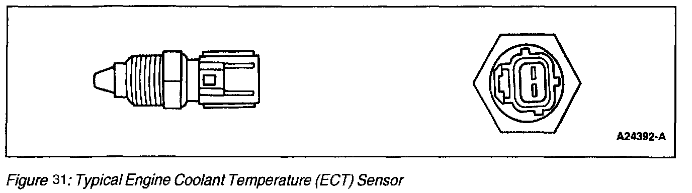 The ECT measures the temperature of the engine coolant. The sensor is threaded into an engine coolant passage. The ECT sensor is similar in construction to the IAT sensor.