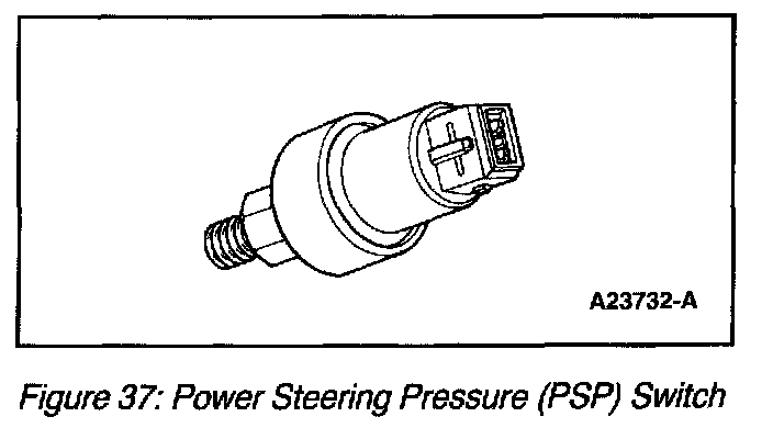 The Power Steering Pressure (PSP) switch monitors the hydraulic pressure within the power steering system. The PSP switch is a normally closed switch that opens as the hydraulic pressure increases. The PCM uses the input signal from the PSP switch to compensate for additional loads on the engine by adjusting the idle rpm and preventing engine stall during parking maneuvers. Also, the PSP switch signals the PCM to adjust transmission electronic pressure control pressure during the increased engine load, for example during parking maneuvers.