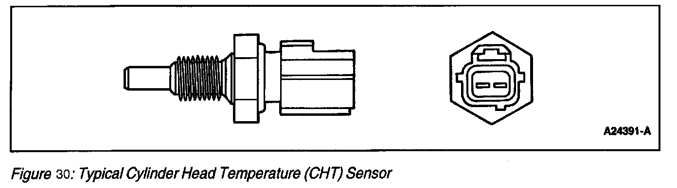 The Cylinder Head Temperature (CHT) sensor is a thermistor device in which resistance changes with temperature. The electrical resistance of a thermistor decreases as temperature increases, and increases as temperature decreases. The varying resistance affects the voltage drop across the sensor terminals and provides electrical signals to the PCM corresponding to temperature.
