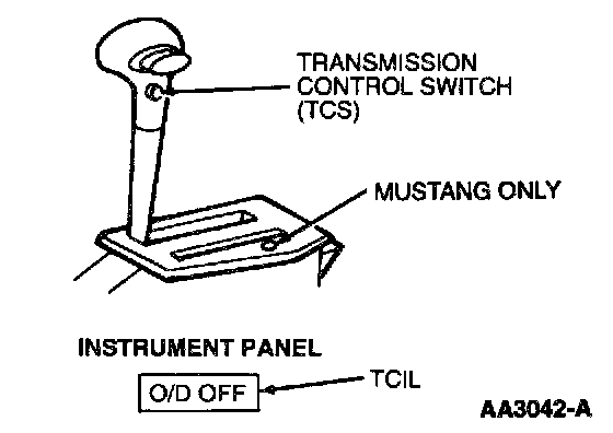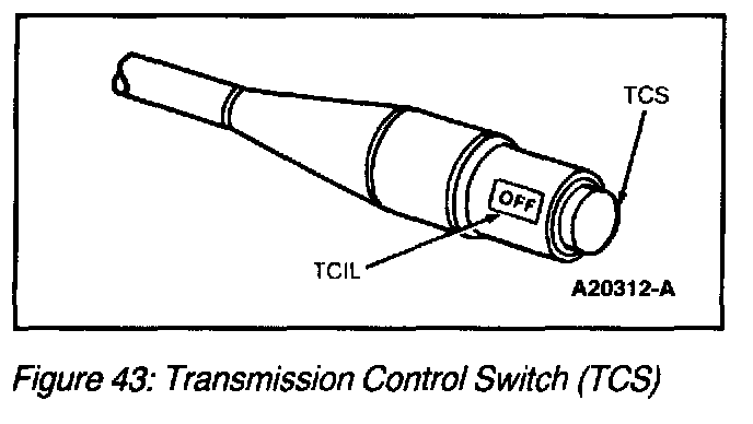 The Transmission Control Switch (TCS) signals the PCM with keypower whenever the TCS is pressed. On vehicles with this feature, the Transmission Control Indicator Lamp (TCIL) lights when the TCS is cycled to disengage overdrive. The operator of the vehicle controls the position of the TCS.