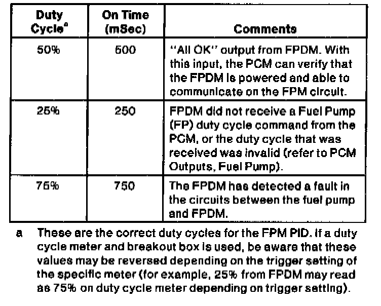 The Fuel Pump Driver Module (FPDM) communicates diagnostic information to the powertrain control module through the Fuel Pump Monitor circuit. This information is sent by the FPDM as a duty cycle signal. The three duty cycle signals that may be sent are listed in the table.
