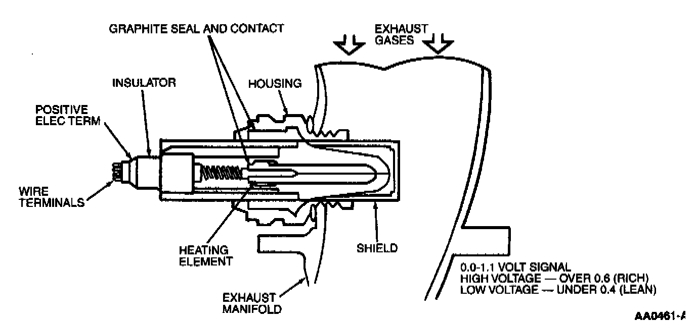 The Heated Oxygen Sensor (HO2S) detects the presence of oxygen in the exhaust and produces a variable voltage according to the amount of oxygen detected. A high concentration of oxygen (lean air/fuel ratio) in the exhaust produces a low voltage signal less than 0.4 volt. A low concentration of oxygen (rich air/fuel ratio) produces a high voltage signal greater than 0.6 volt. The HO2S provides feedback to the PCM indicating air/fuel ratio in order to achieve a near stoichiometric air/fuel ratio of 14.7:1 during closed loop engine operation. The HO2S generates a voltage between 0.0 and 1.1 volts.