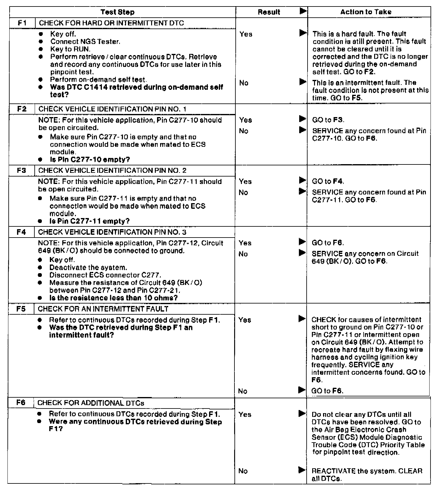 The air bag Electronic Crash Sensor (ECS) module monitors the voltage at Pins 10, 11 and 12 to determine if it is installed on the correct vehicle. If the ECS detects an incorrect voltage on any of these pins, it will store a Diagnostic Trouble Code (DTC) C1414 in memory and flash a Lamp Fault Code (LFC) 29 (or higher priority code if one exists) on the air bag indicator.