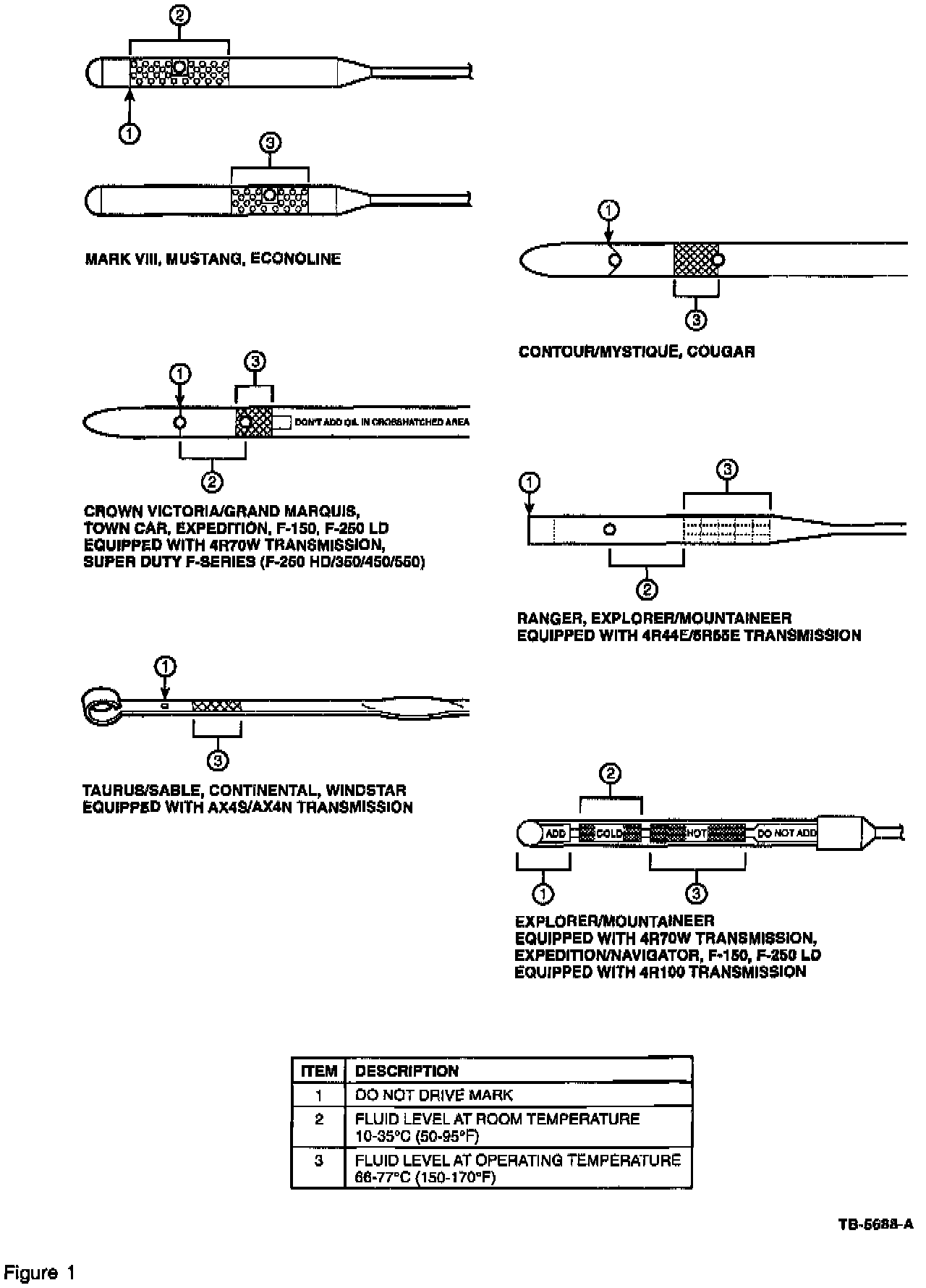 The appropriate year Workshop Manual contains the proper transmission fluid checking and adding procedure specific to each vehicle model. Prior to the update of the Pre-Delivery Inspection Manual, refer to the appropriate model year Workshop Manual by vehicle line for the proper information on checking and adding transmission fluid. Dipstick application is model dependent (Figure 1).