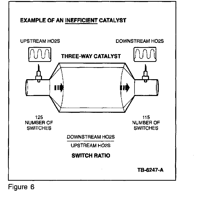 The upstream H025 sensors will have a high switch frequency, due to normal closed loop fuel control. With an efficient catalyst, the downstream H025 will have a low switch frequency. The switch ratio is determined by dividing the number of downstream switches by the number of upstream switches over a given period of time. As the catalyst ages (or if the catalyst is damaged or contaminated), the downstream switches will increase. When the downstream switch rate crosses a threshold value (approximately 0.75 switch ratio), a code is stored (P0420 and/or P0430) and the MIL illuminates (refer to Figures 5 and 6).