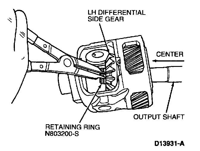 11. Push output shaft towards center of differential housing. Slide LH differential side gear upward to gain access to retaining ring. Use snap ring pliers to remove retaining ring. Remove output shaft.