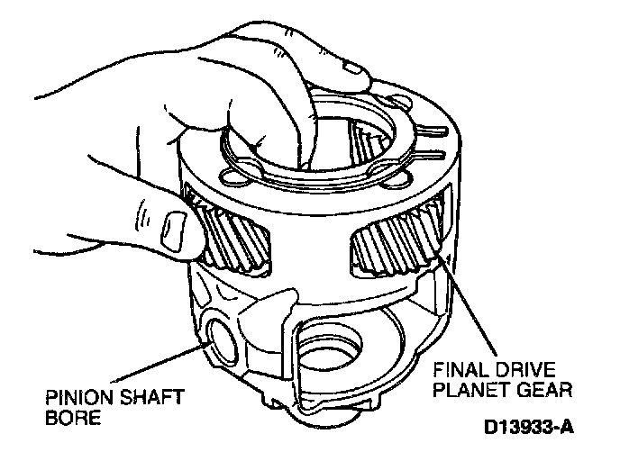1. Inspect differential pinion and side gears for looseness, discoloration, cracks or excessive gear tooth wear. Inspect four final drive planet gears, two pinion shaft bores and pinion shaft for looseness, discoloration, cracks, excessive gear tooth wear or galling. Service as required.
