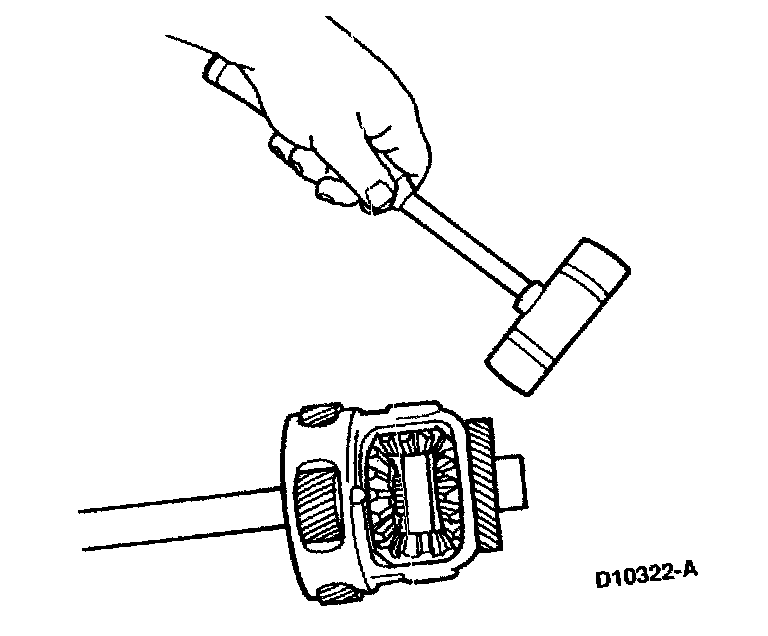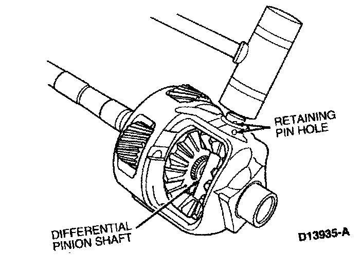 3. Tap differential pinion shaft through differential case, differential side gear thrust washers and differential side gears using a soft mallet. Make sure to align retaining pin hole in differential pinion shaft with hole in differential case.