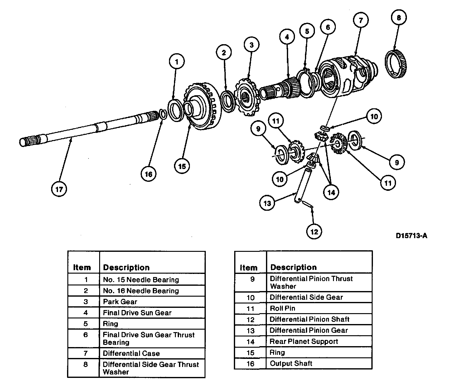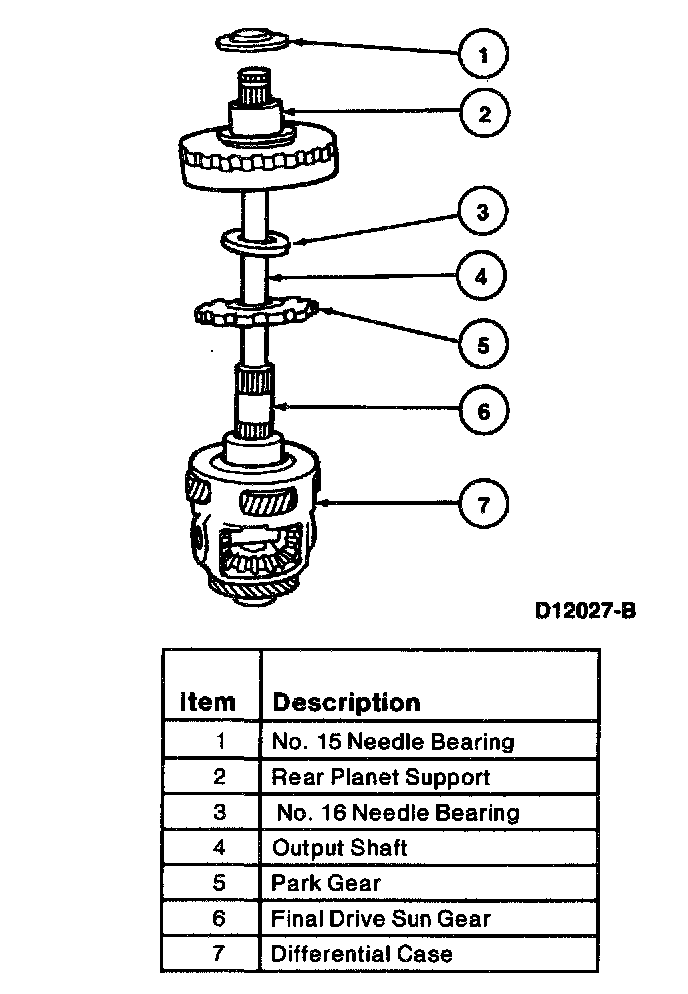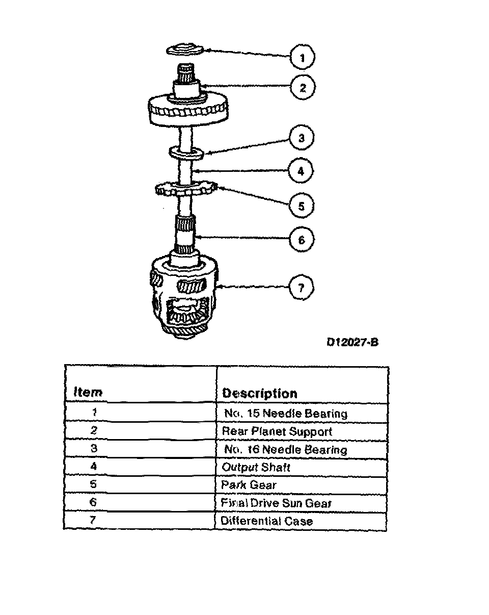 1. Remove rear planet support, No. 15 needle bearing, park gear, No. 16 needle bearing and final drive sun gear by lifting off.