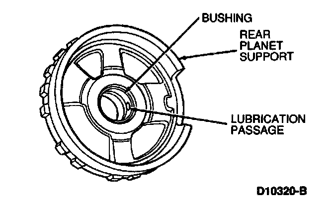 2. Check to be sure hole in bushing in rear planet is aligned with lubrication passage. If not, replace support, as bushing is not serviced.