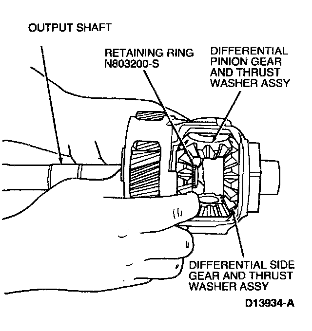 2. If removed, install two differential side gear thrust washer, differential side gear, output shaft and retaining ring. Walk differential pinion gears and differential side gear thrust washers into position by rotating output shaft.