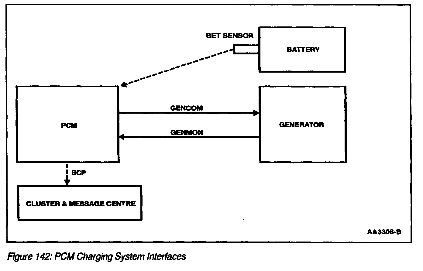 The PCM-Controlled charging system (Figure 142) provides many additional benefits over the current Integral Generator Regulator system. The first benefit is improved battery life. In an integral generator regulator system, the regulator set point is established by a temperature sensor in the regulator which estimates battery temperature. Field data has shown this approach lacks accuracy. With a PCM-controlled generator, the regulator voltage set point is determined by the PCM and communicated to the regulator via the generator communication line. The PCM will use a calibratable algorithm to estimate battery temperature. Improving battery temperature estimates will reduce battery damage caused by over- and undercharging.