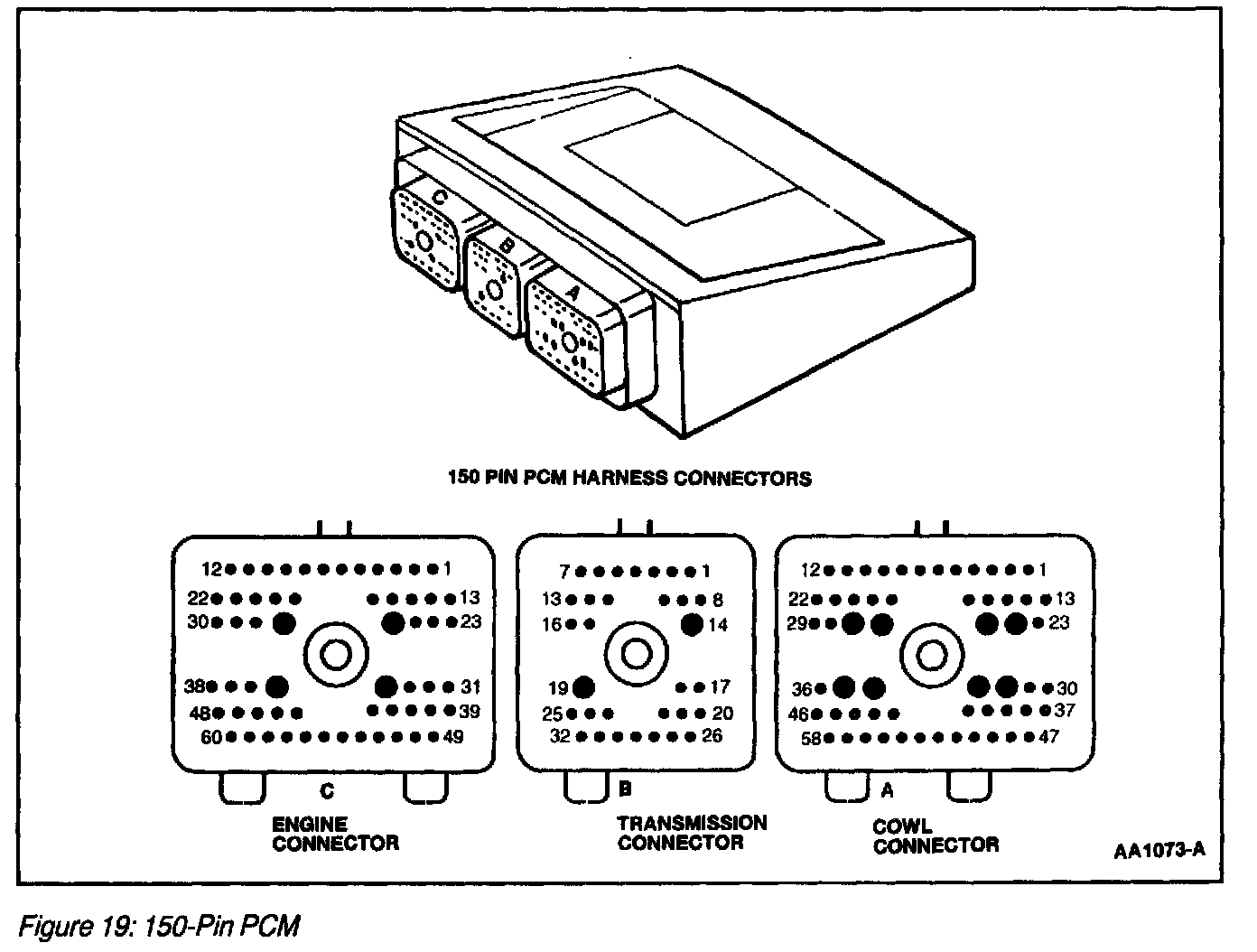 The center of the Electronic EC system is a microprocessor called the Powertrain Control Module (PCM). LS6/LS8 and 2002 Explorer/Mountaineer applications use a 150-pin PCM (Figure 19). This PCM will have three separate electrical harness connectors. All other applications will continue to use the standard 104-pin PCM (Figure 18). The PCM receives input from sensors and other electronic components (switches, relays). Based on information received and programmed into its memory, the PCM generates output signals to control various relays, solenoids and actuators.