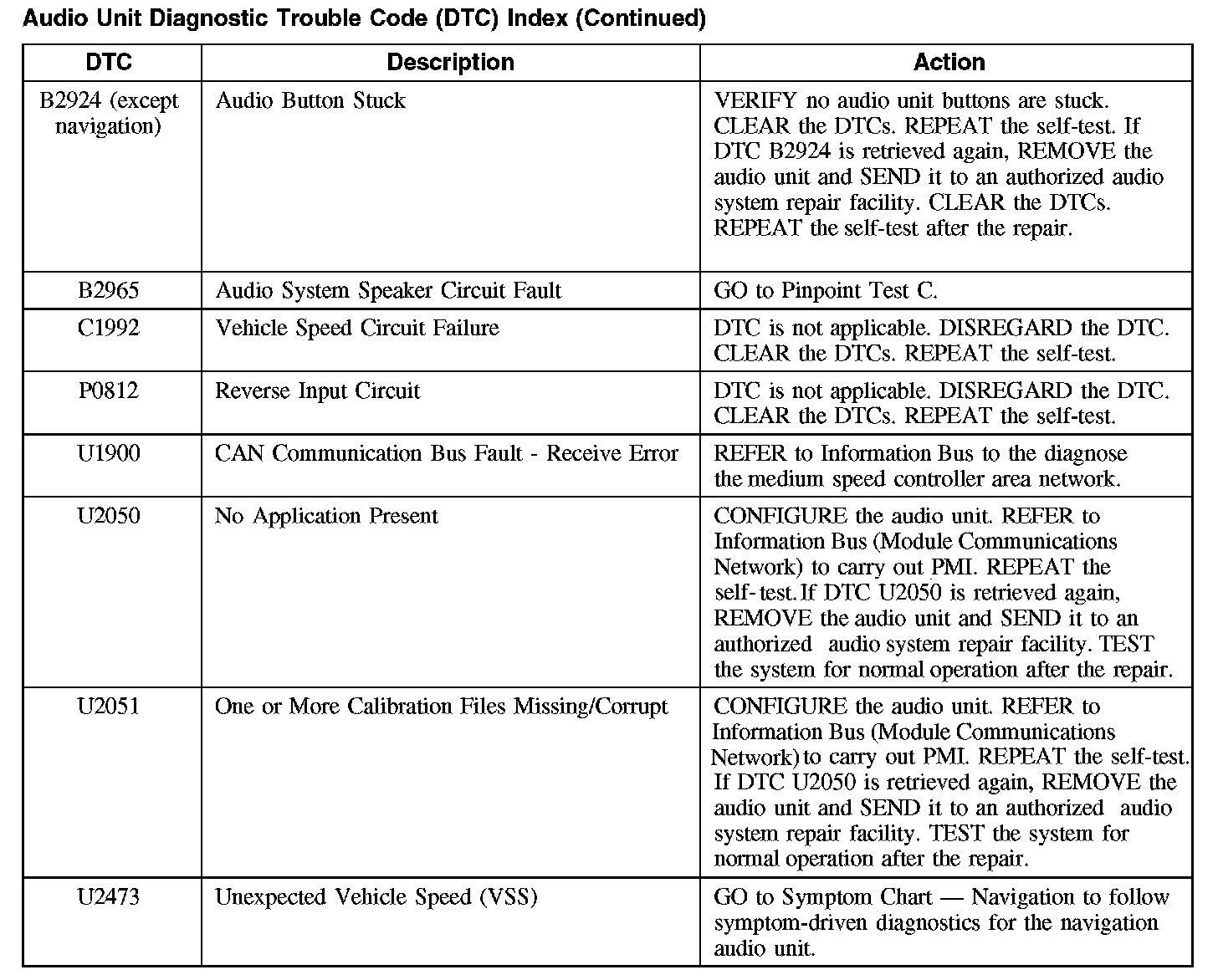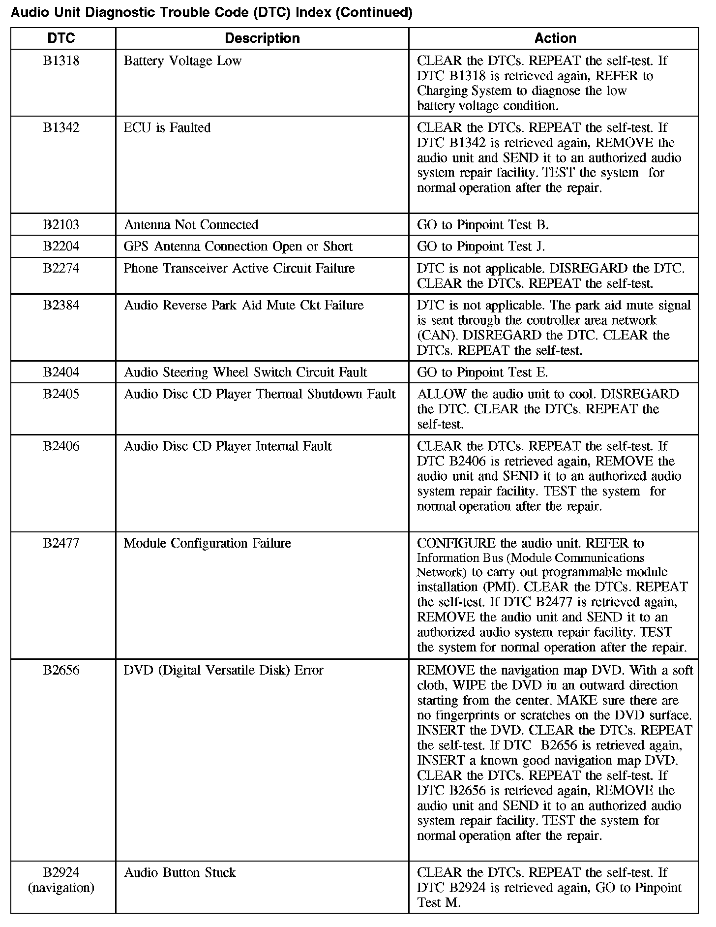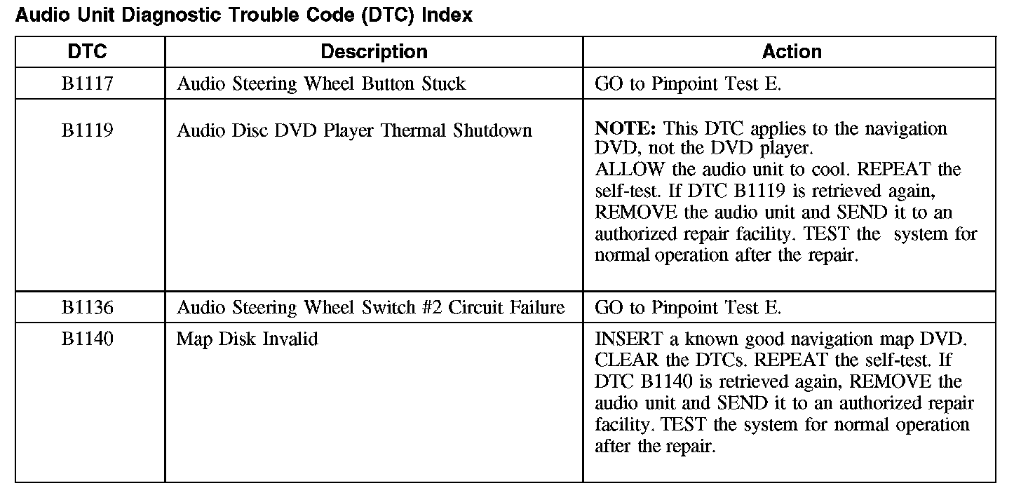 Audio Unit Diagnostic Trouble Code (DTC) Index