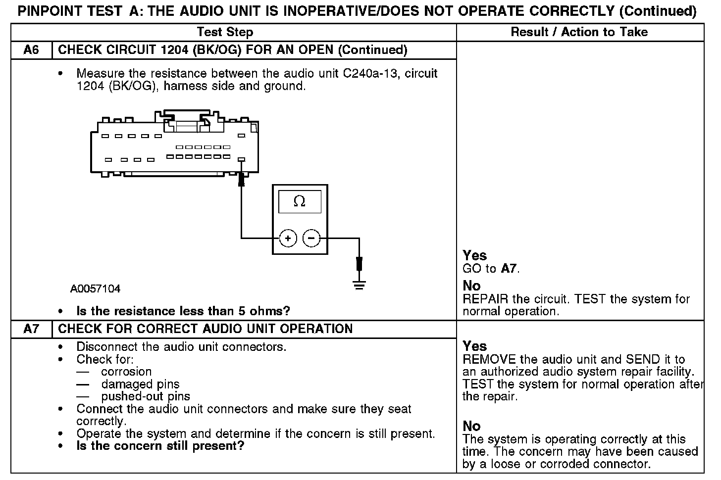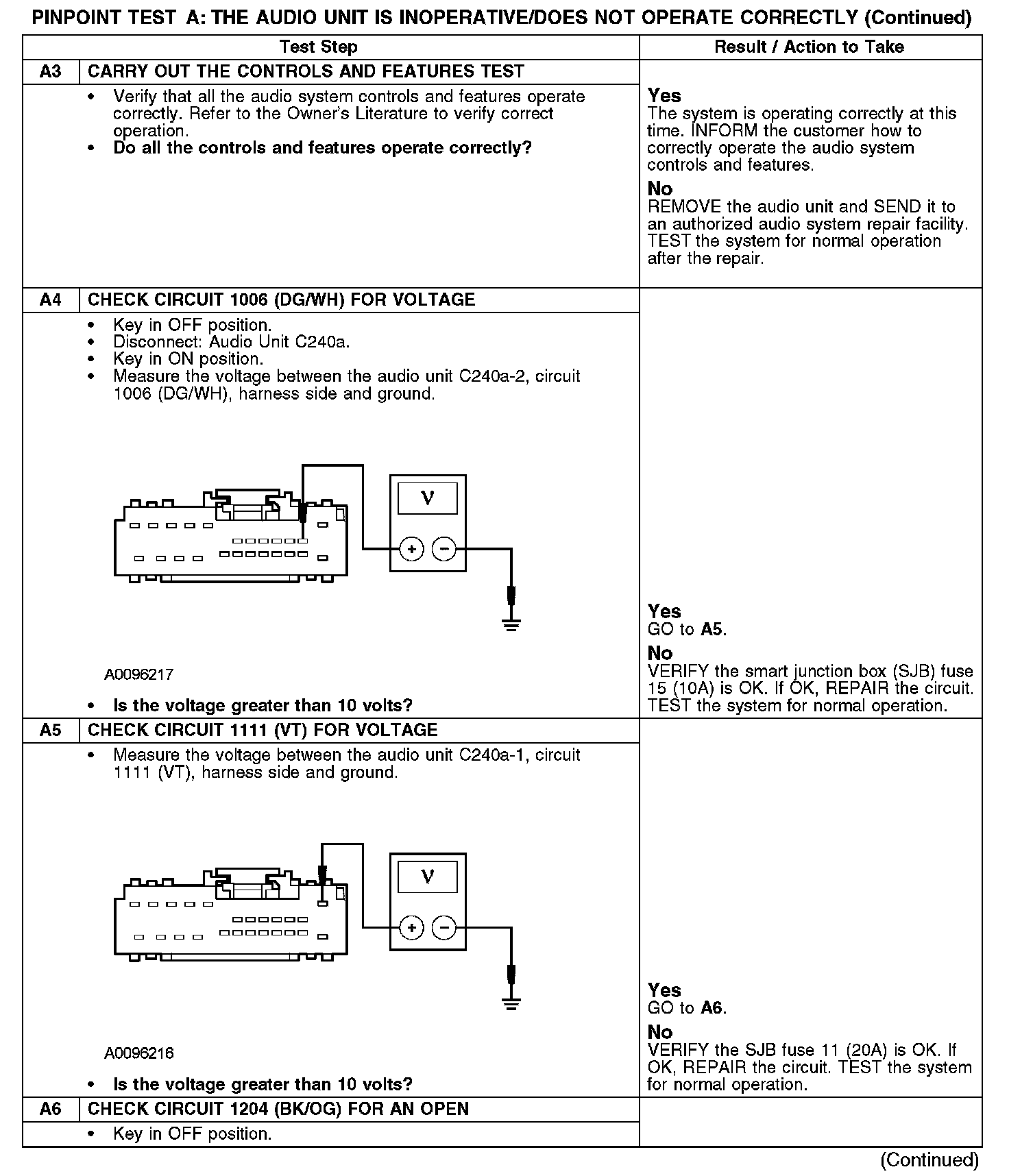 The audio unit receives voltage at all times through circuit 1111 (VT), and it receives accessory delay voltage through circuit 1006 (DG/WH). The audio unit is provided ground through circuit 1204 (BK/OG).