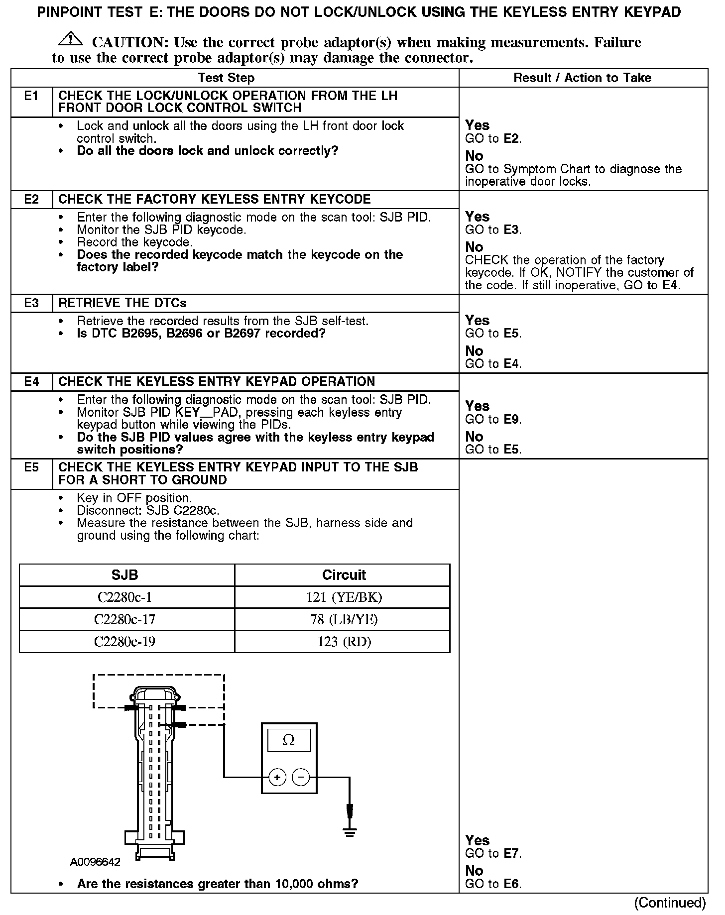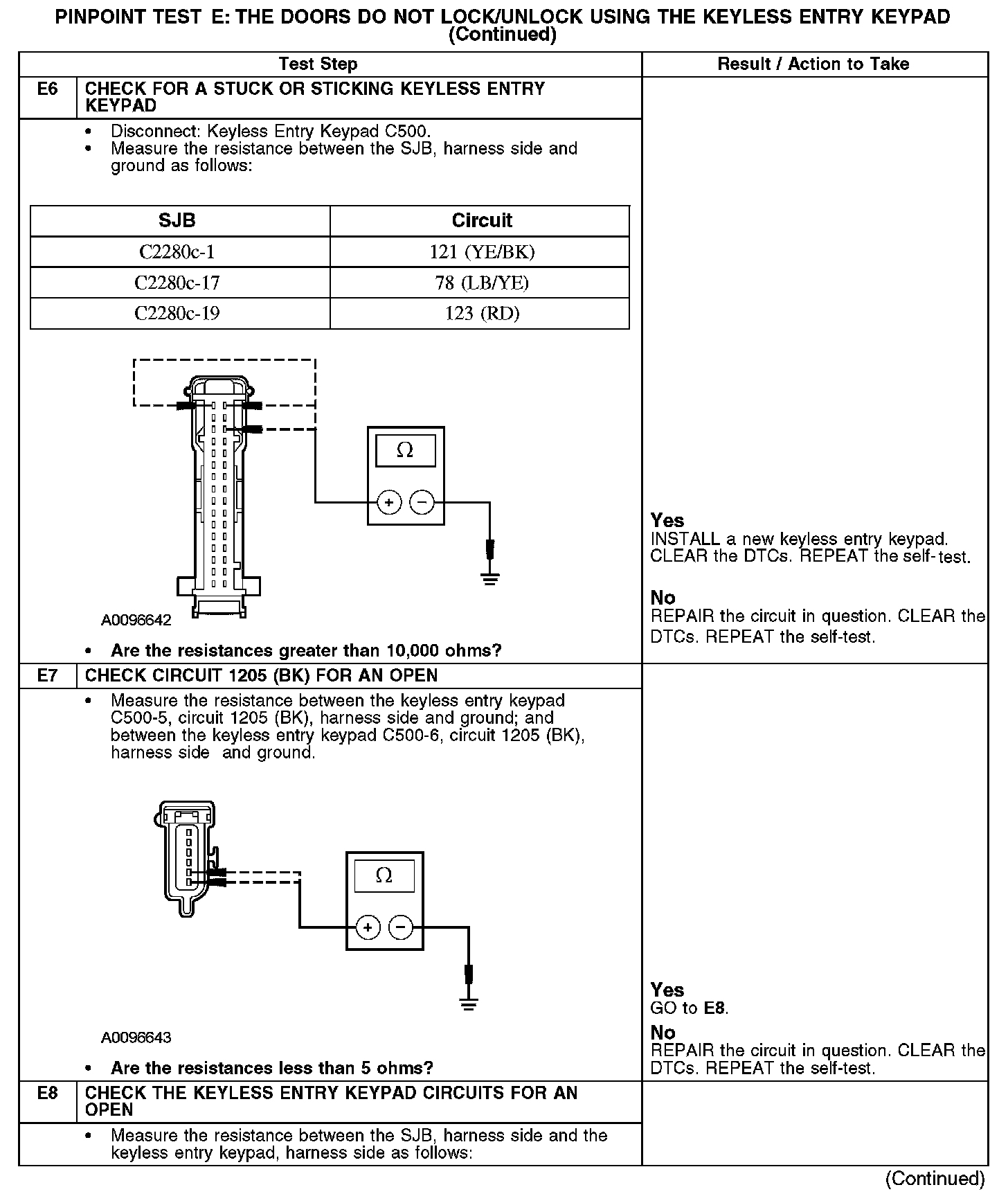 The smart junction box (SJB) energizes the lock or unlock relays based upon input from the keyless entry keypad. The keyless entry keypad uses circuits 78 (LB/YE), 121 (YE/BK) and 123 (RD) to send signals to the SJB by grounding the selected circuit through the keyless entry keypad on circuit 1205 (BK). The SJB locks or unlocks the doors and the liftgate (wagon) based on keyless entry keypad input.