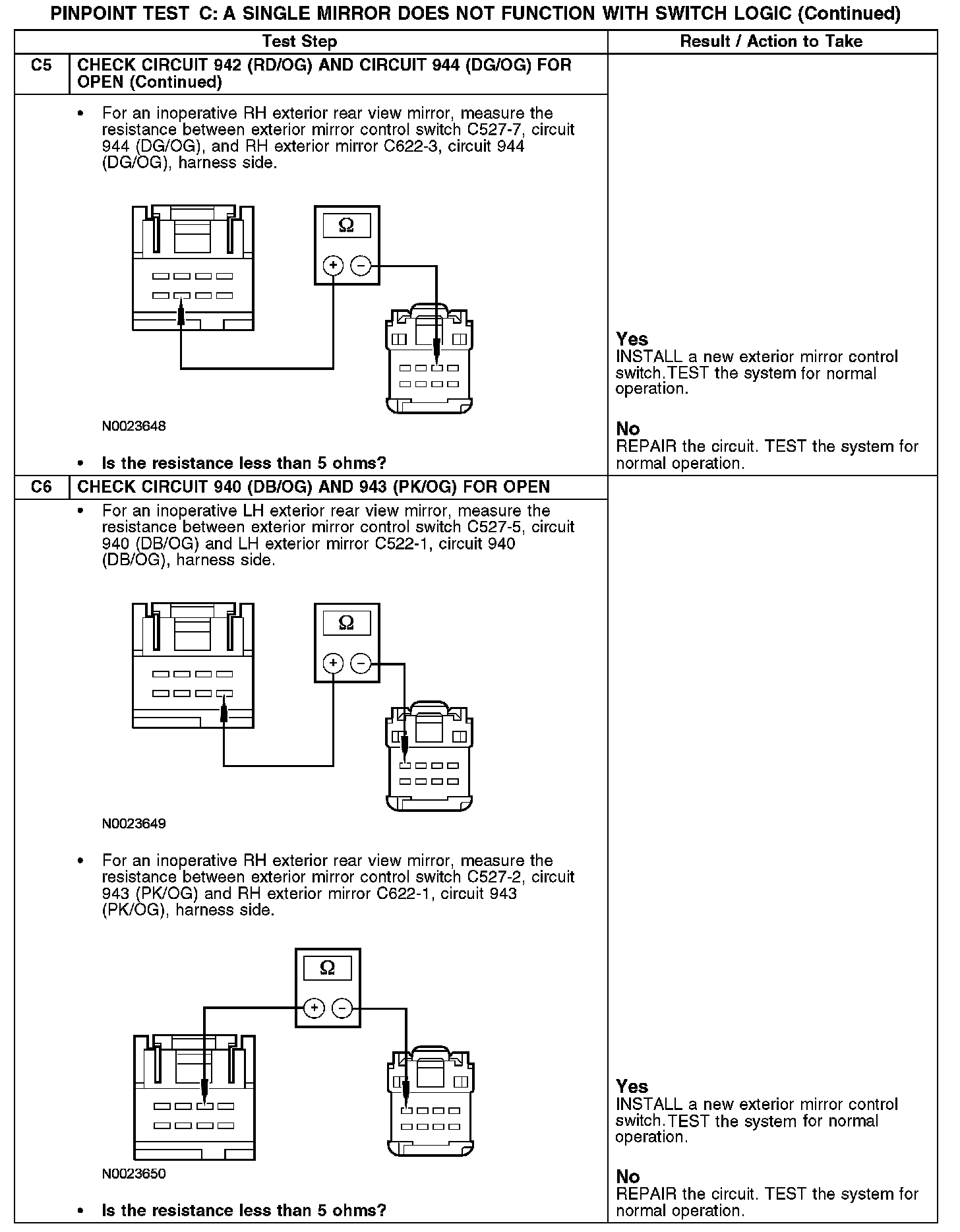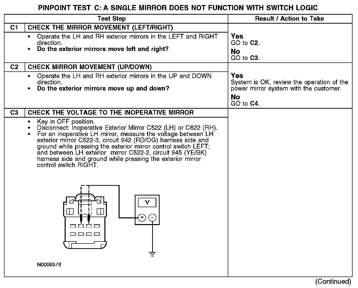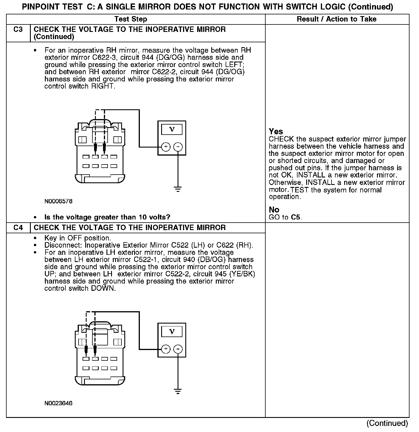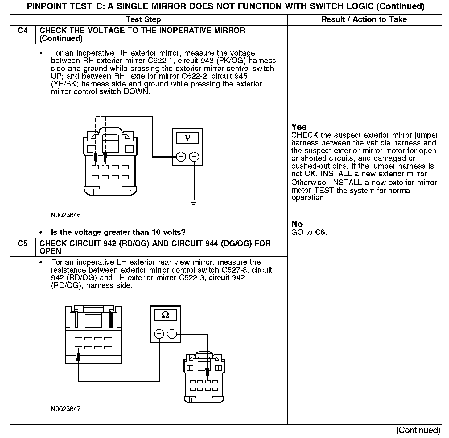 - When power is received through circuit 942 (RD/OG) or 944 (DG/OG) and ground through circuit 945 (YE/BK), the LH or RH exterior mirror glass will move RIGHT.