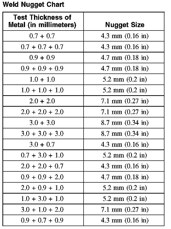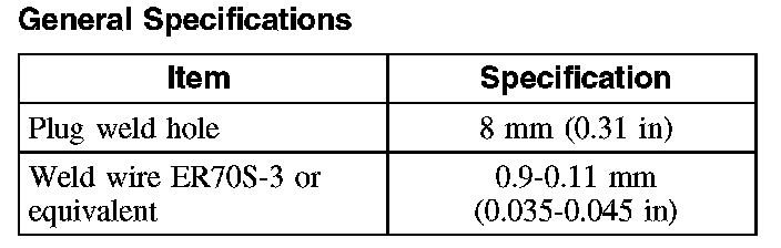 - Factory spot welds may be substituted with either resistance spot welds or MIG plug welds. Spot/plug welds should equal factory welds in both location and quantity. Do not place a new spot weld directly over an original weld location. Plug weld hole should equal 8 mm (0.31 in) diameter.