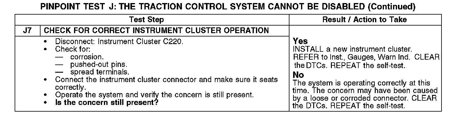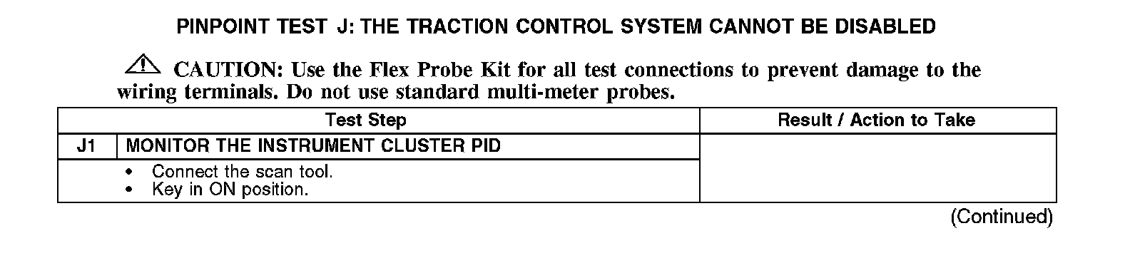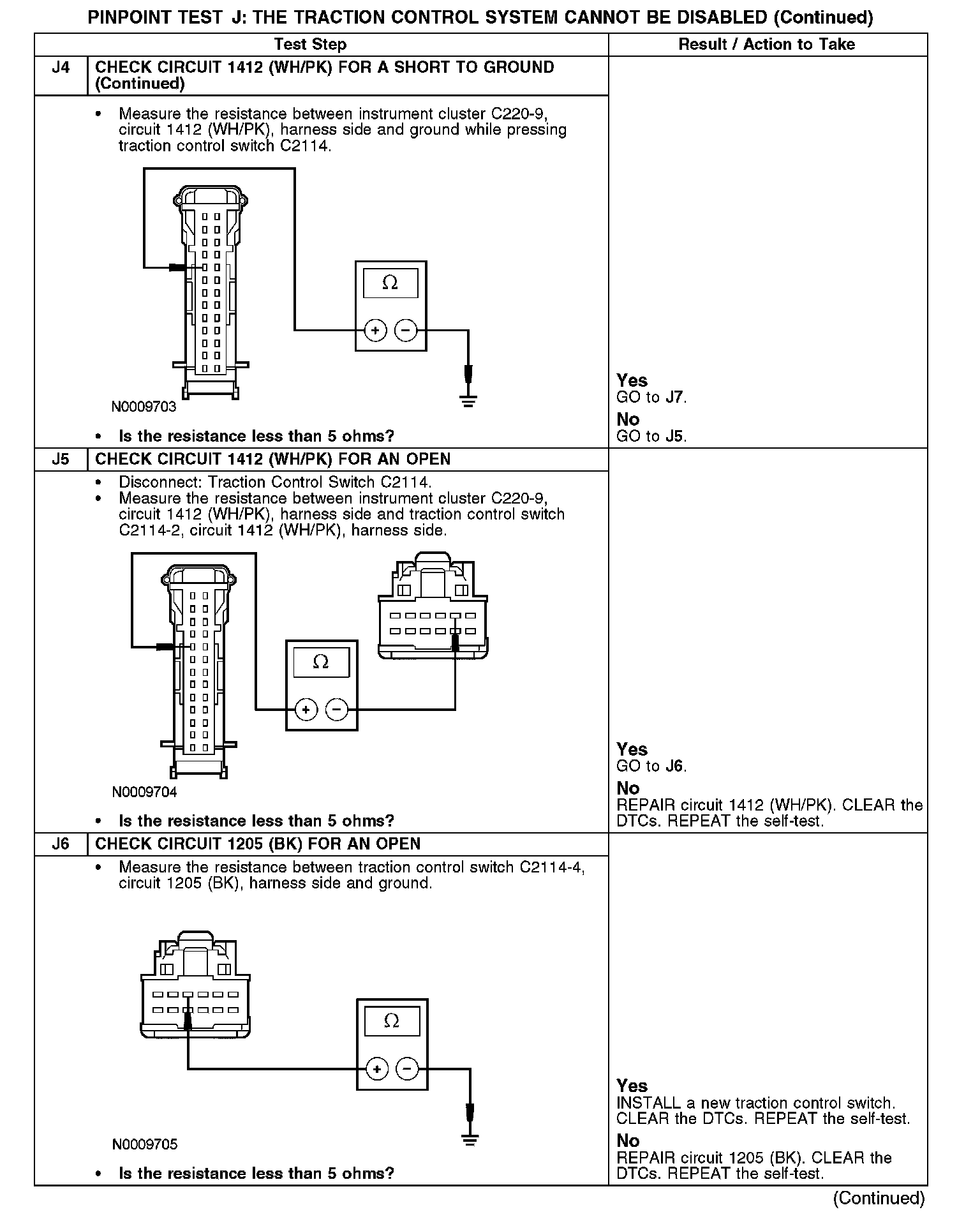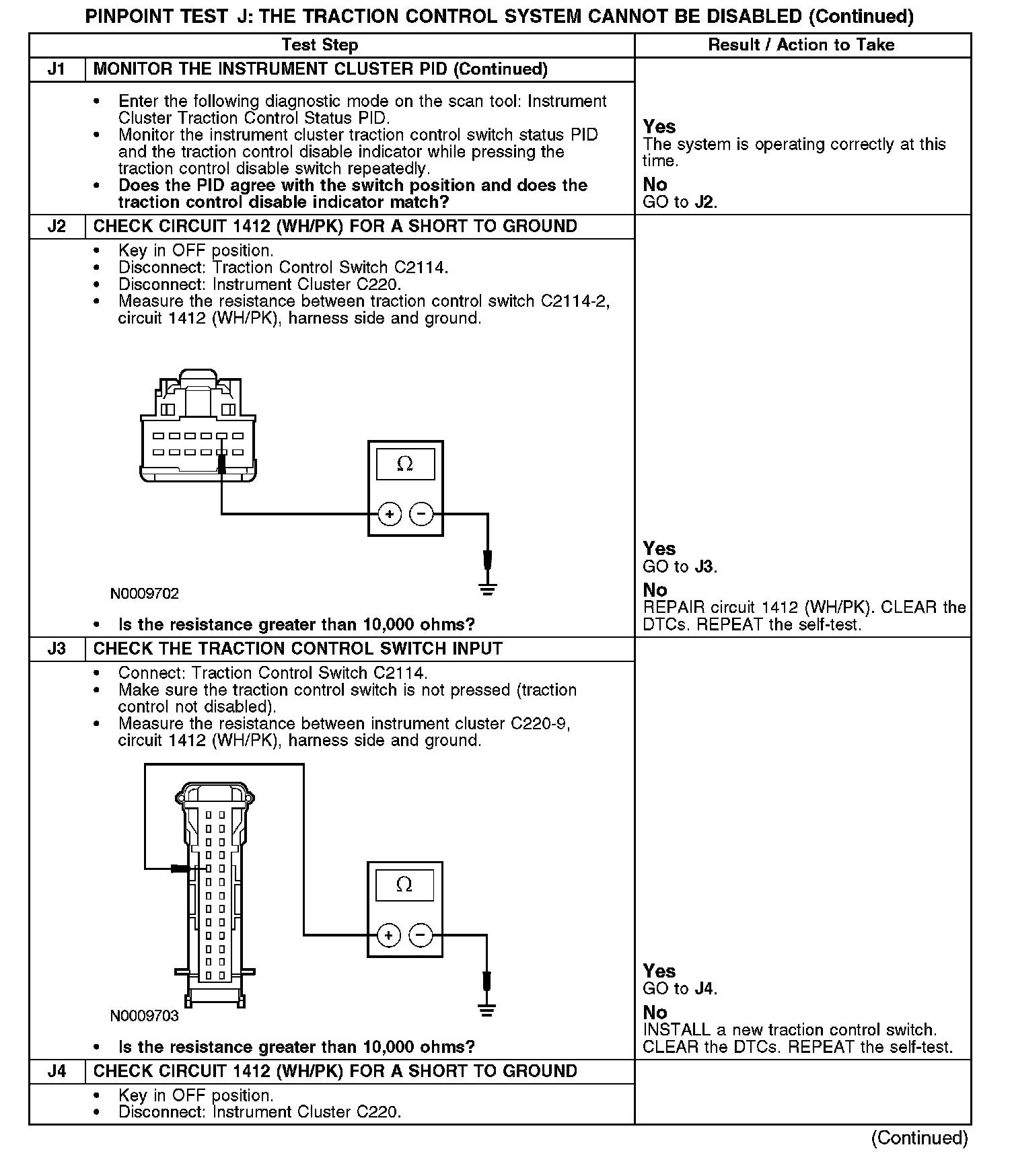 The instrument cluster sends a voltage reference signal to the traction control switch along circuit 1412 (WH/PK). When the traction control switch is pressed, the signal is grounded along circuit 1205 (BK). The instrument cluster then sends a traction control disable command over the controller area network (CAN).