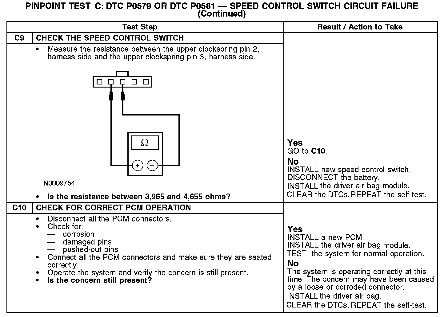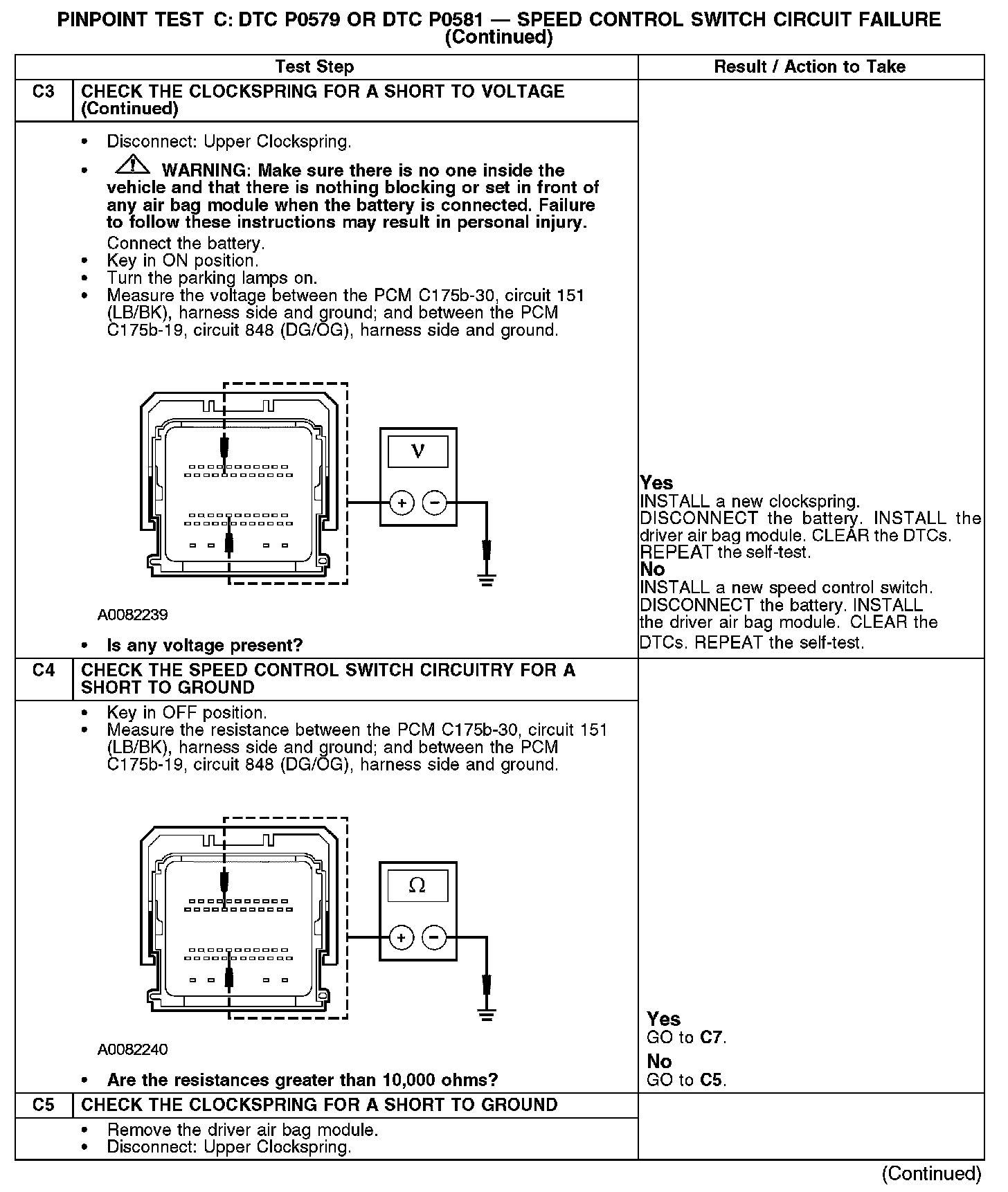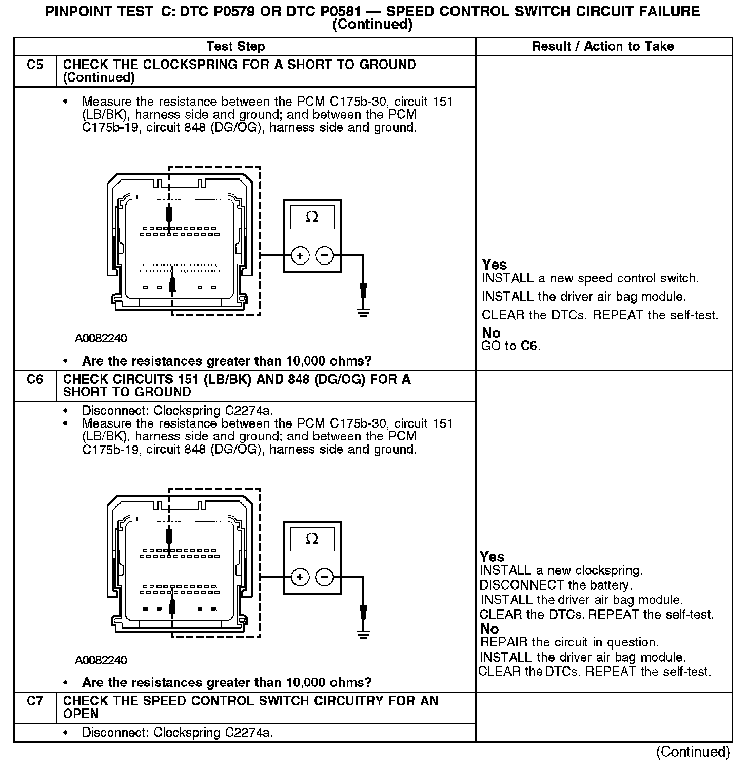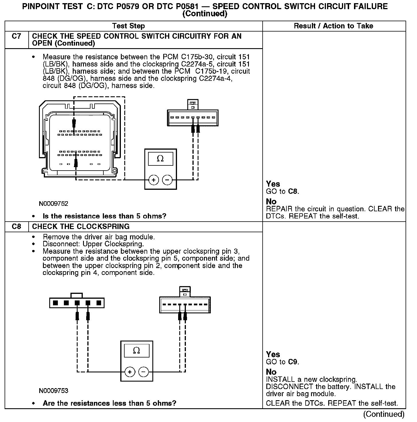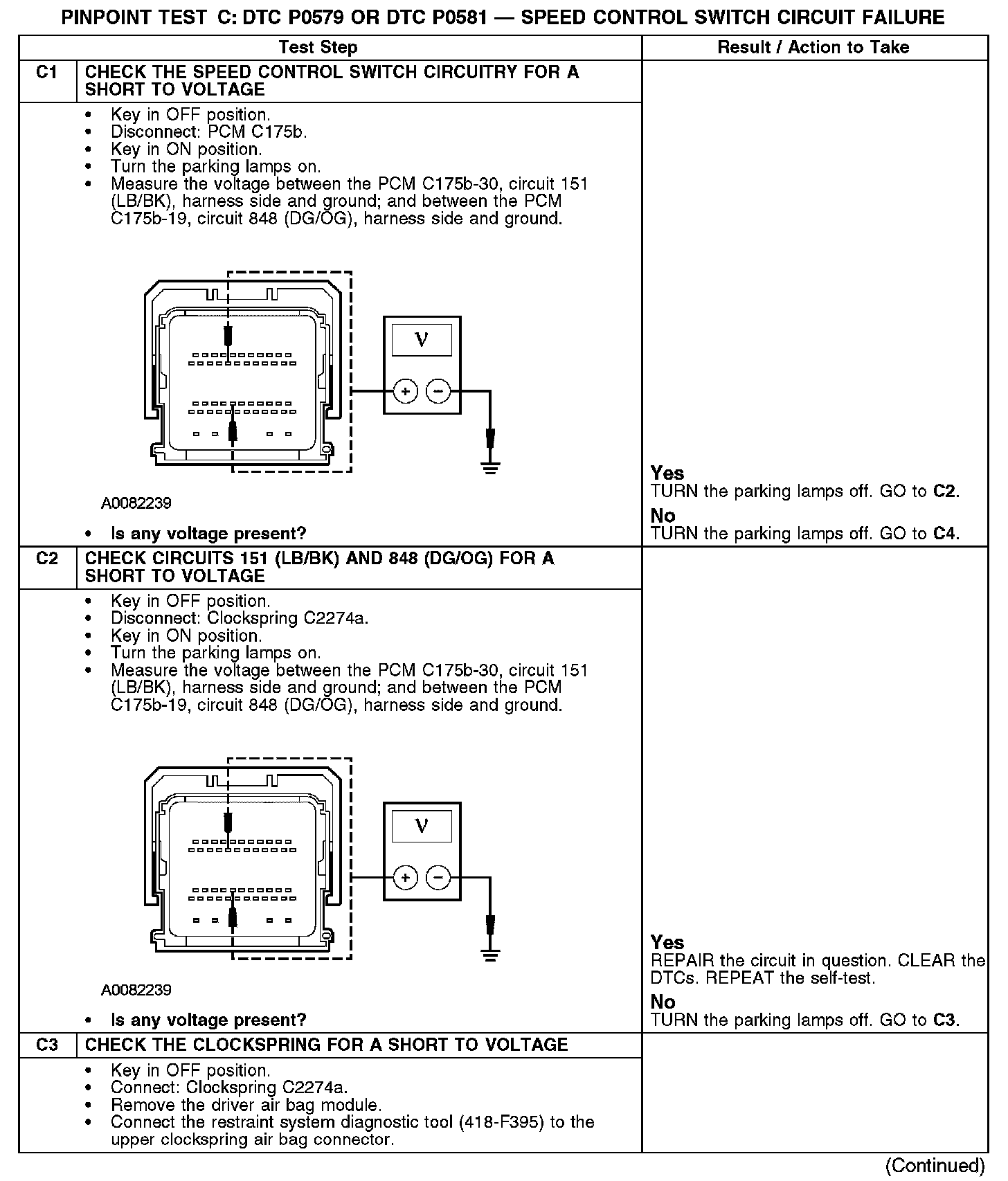 The powertrain control module (PCM) sends a signal through circuit 848 (DG/OG) to the speed control switches which passes through the clockspring. The return signal is sent through circuit 151 (LB/BK) and the clockspring.