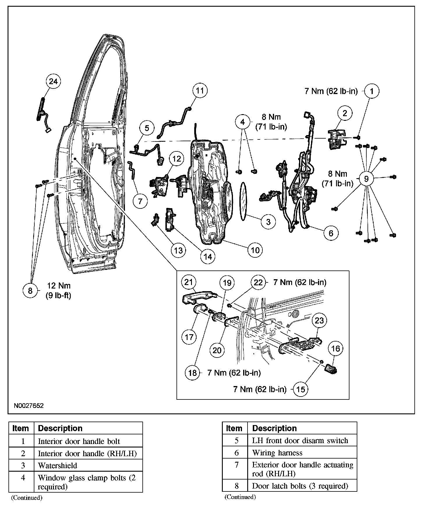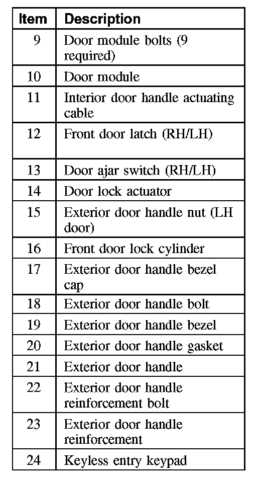 FRONT DOOR HANDLES, LOCKS AND LATCHES - EXPLODED VIEWPart 1:Part 2:Removal and Installation 1. For additional information, refer to the procedures.
