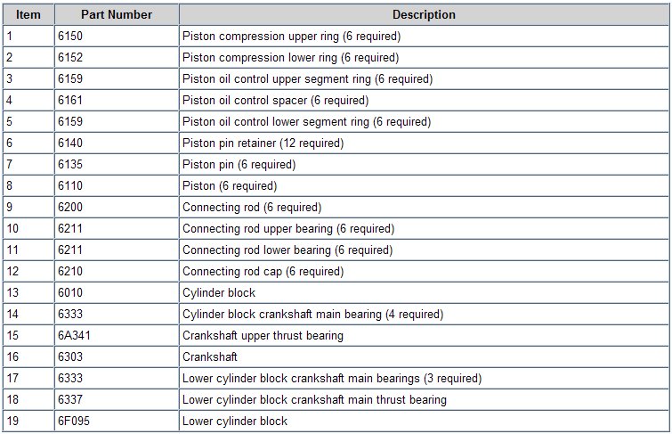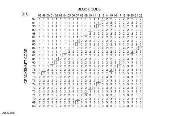 ^ For example: If the block code is *0609*0711* and the crankshaft code is *8580*8082*, main No. 1 should use grade 1 bearings, as determined by the intersection of the 06 block column and the 85 crankshaft row. Mains 2, 3 and 4 should all be grade 2.