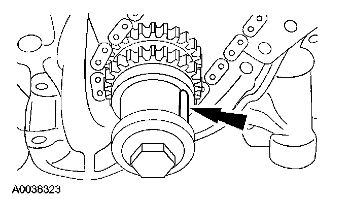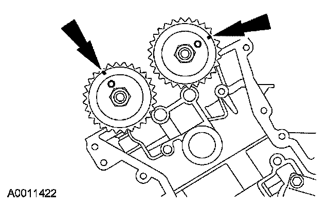 ^ Align the marks on the timing chain with the marks on the camshaft and crankshaft sprockets.