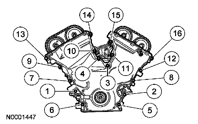 NOTE: The front cover must be installed and the bolts tightened within 4 minutes of sealant application.
