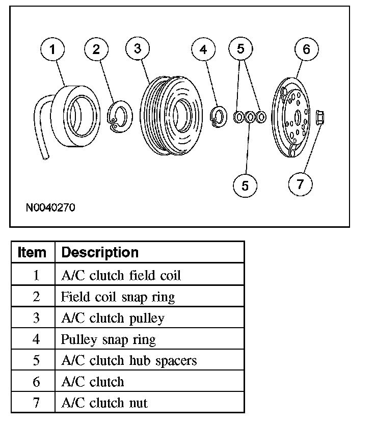 NOTE: Internal A/C compressor components are not serviced separately. The variable scroll compressor is serviced only as an assembly. The A/C clutch, A/C clutch pulley and the A/C clutch field coil are serviceable.