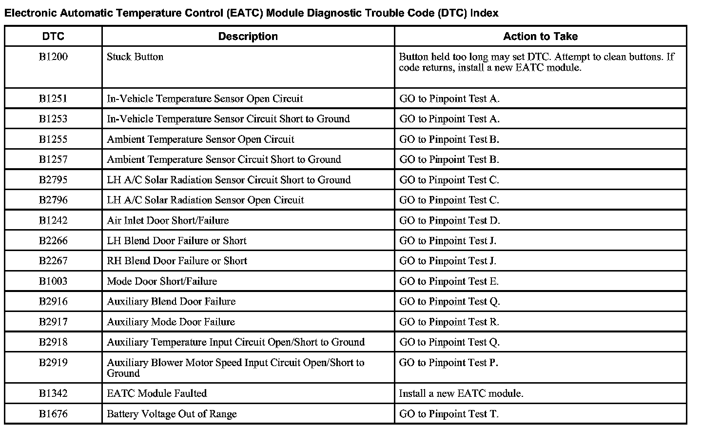Electronic Automatic Temperature (EATC) Module Diagnostic Trouble Code (DTC) Index