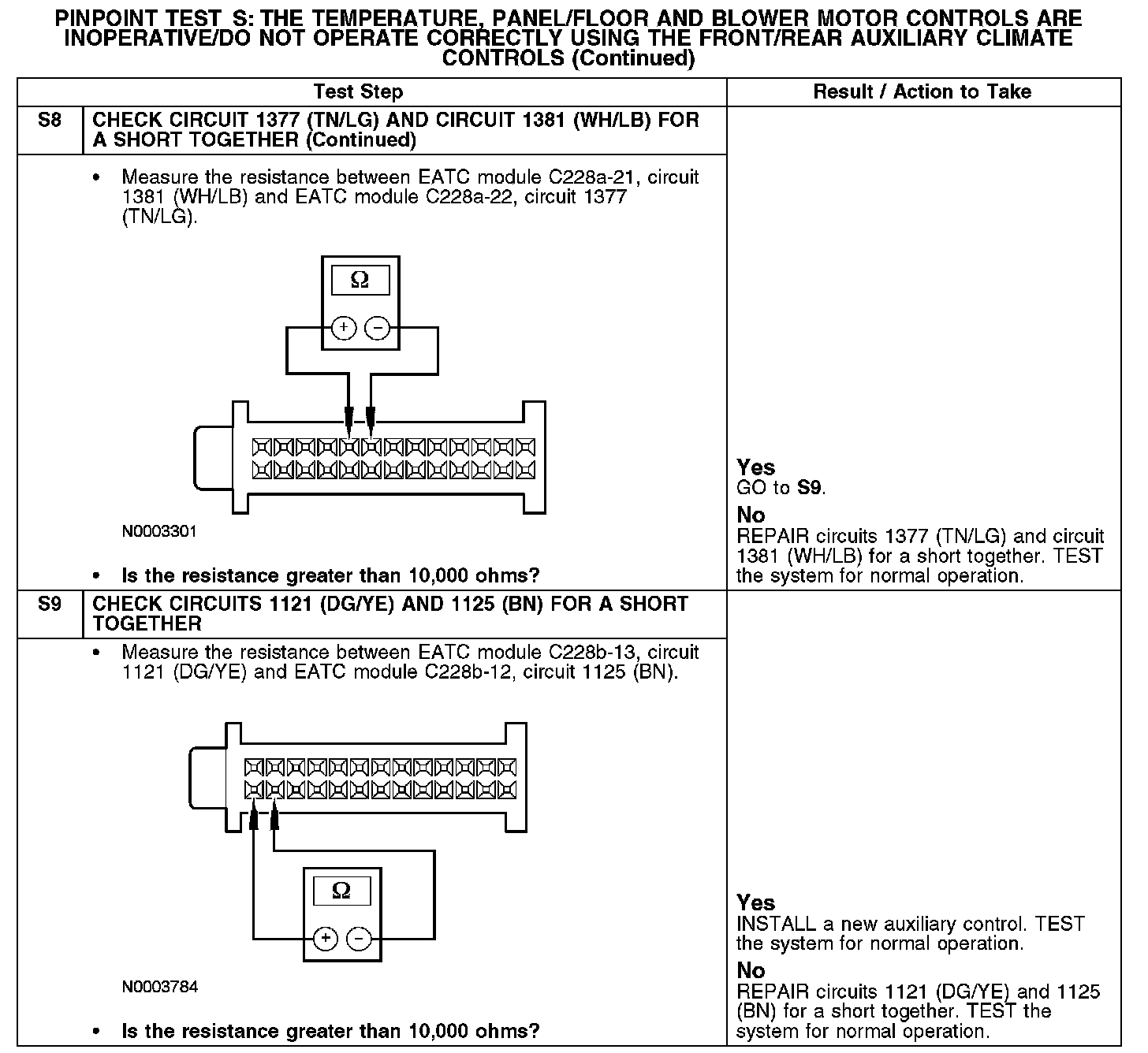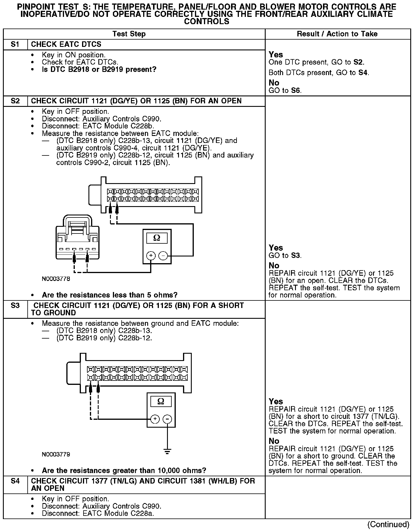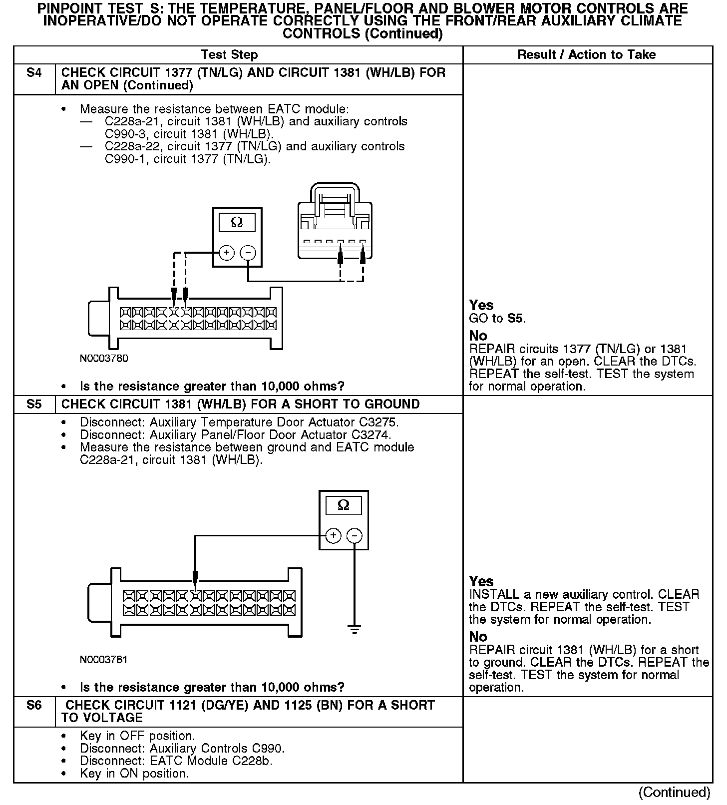 Under normal operation, the panel/floor and cool/warm signal is received by the EATC module from the rear auxiliary control through circuit 1121 (DG/YE). The blower speed signal is received by the EATC from the rear auxiliary control through circuit 1125 (BN). Reference voltage for the auxiliary controls signal resistor is provided by the EATC module through circuit 1381 (WH/LB). Ground for the auxiliary controls signal resistor is provided by the EATC module through circuit 1377 (TN/LG).