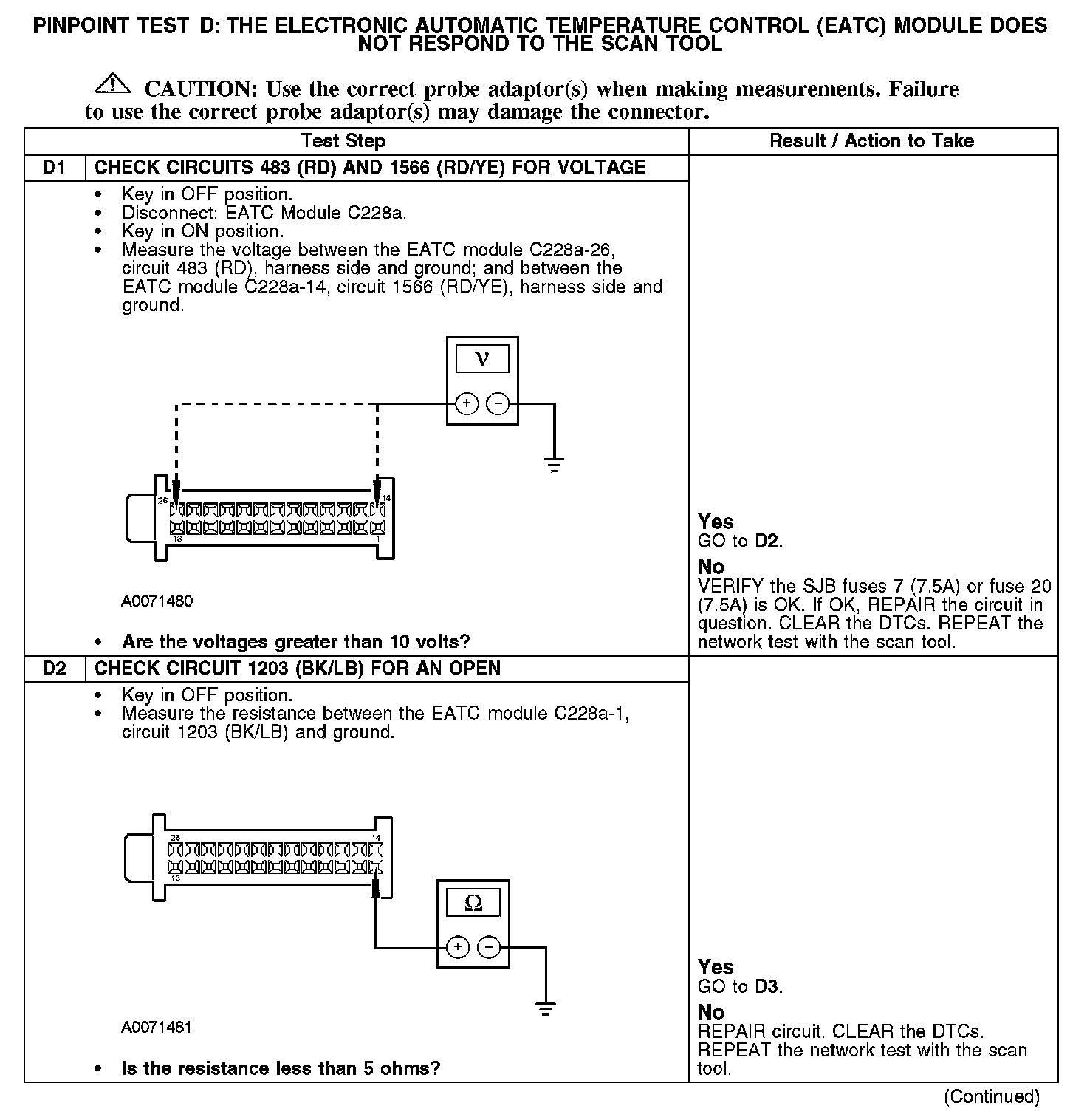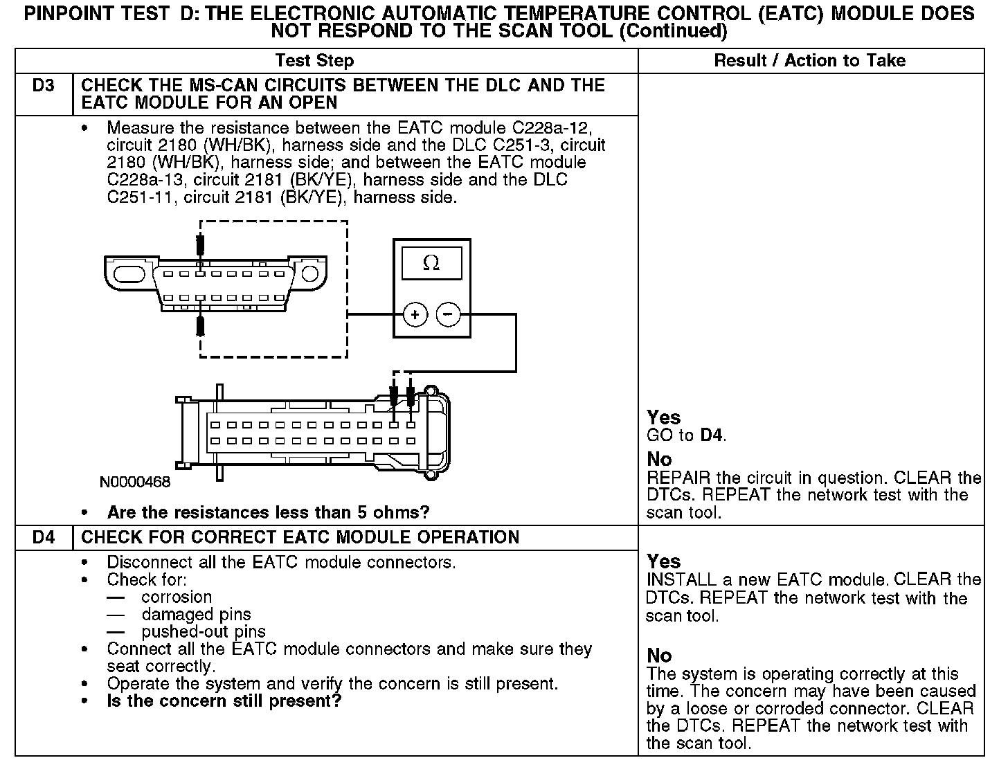 The EATC module communicates with the scan tool through the medium speed controller area network (MS-CAN). Circuits 2180 (WH/BK) (MS-CAN +) and 2181 (BK/YE) (MS-CAN -) provide the network connection to the EATC module. The EATC module is only on vehicles equipped with automatic climate control. The EATC module shares the MS-CAN network with the smart junction box (SJB), the audio unit, the driver seat module (DSM), the digital versatile disc (DVD) player, the satellite radio receiver, and the instrument cluster. Voltage for the EATC module is provided by circuits 483 (RD) and 1566 (RD/YE). Circuit 1203 (BK/LB) provides ground.